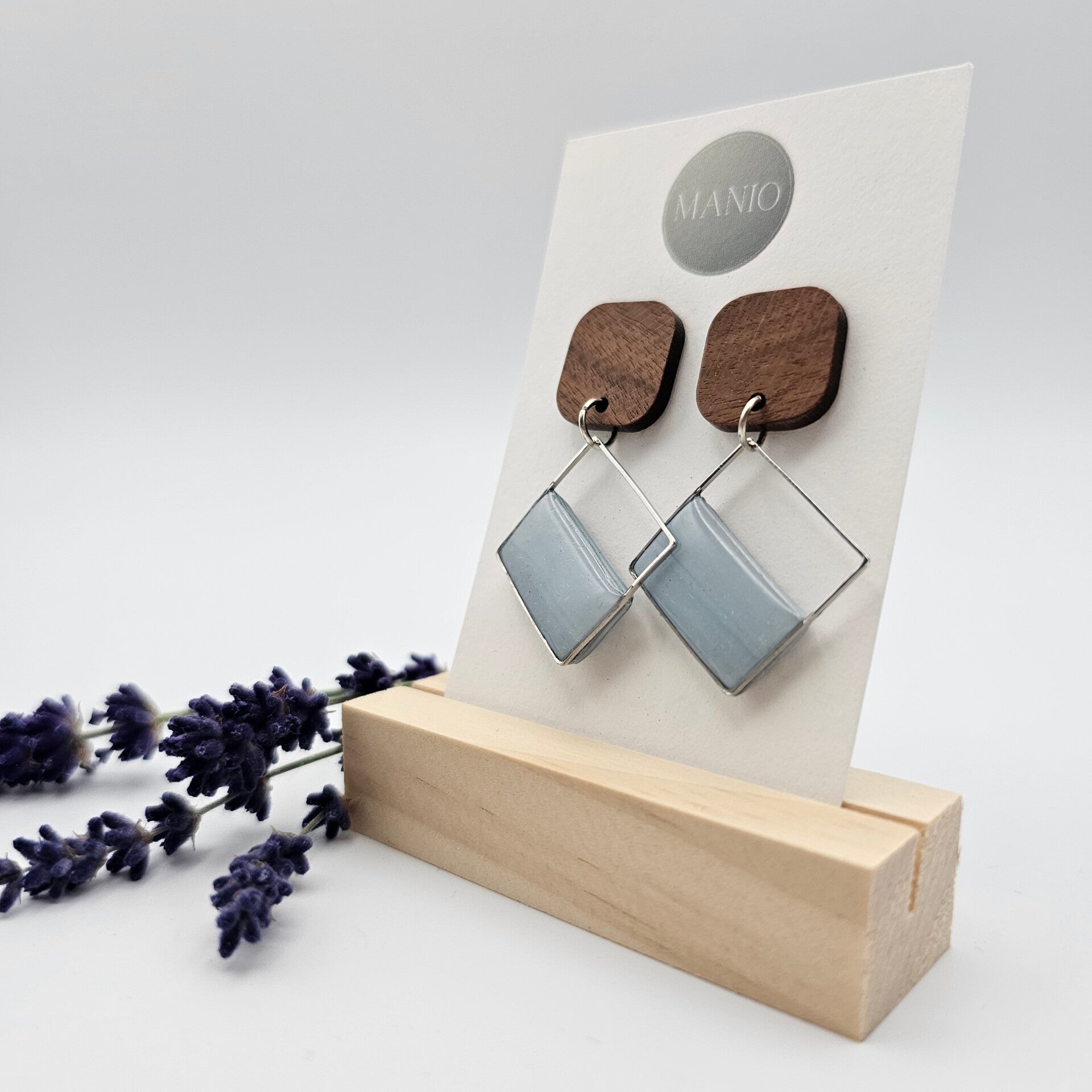 Statement-Ohrringe in quadratischer Form, verschmolzen mit Polymerton in einem hellen Blauton mit Holz-Ohrsteckern.
