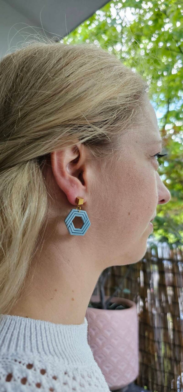 Dieses paar Ohrringe besteht aus einem Luna Anhänger, welcher sich durch die Form des Hexagons auszeichnet ist aus Fimo (Polymer Clay) hergestellt.