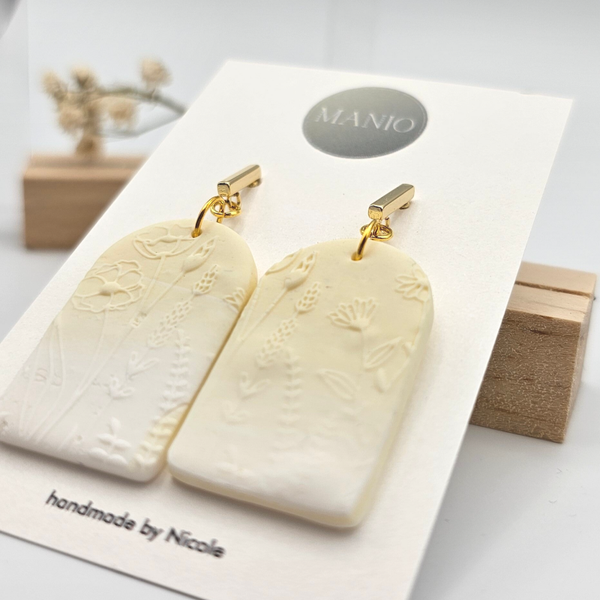Dieses Ohrringpaar hat eine Blumenprägung und einen schönen Farbverlauf in Gelb/Weiß.