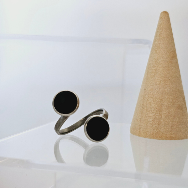 Silberfarbener Ring mit schwarzem Fimo Design - leicht verstellbar in der Größe.