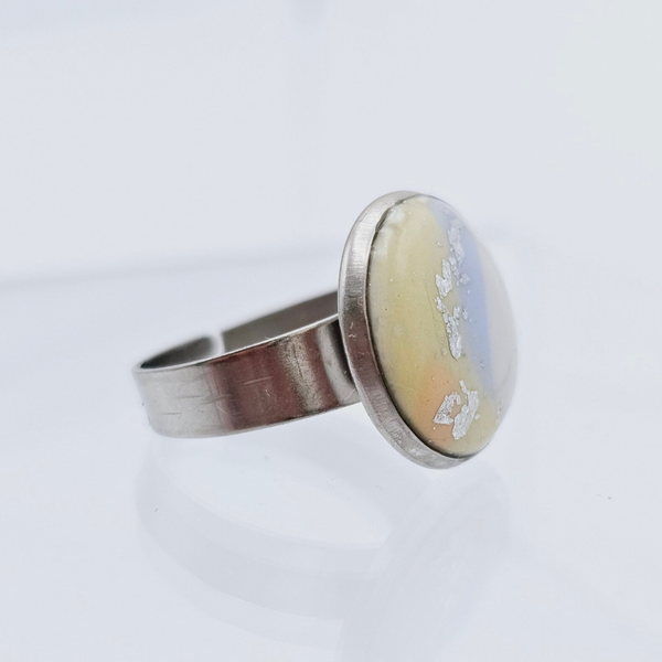 Silberfarbener Ring mit einem Orange/ Grün/ Blau & Weißem Fimo Design.