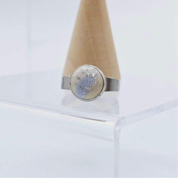 Silberfarbener Ring mit einem Blau & Weißem Fimo Design.