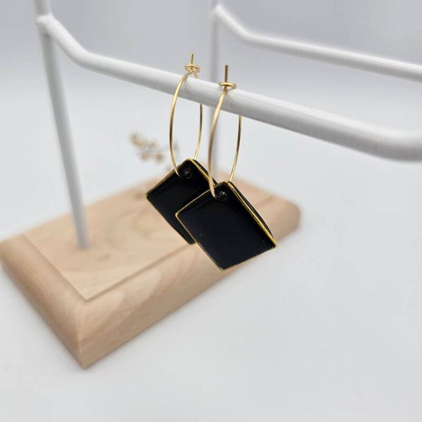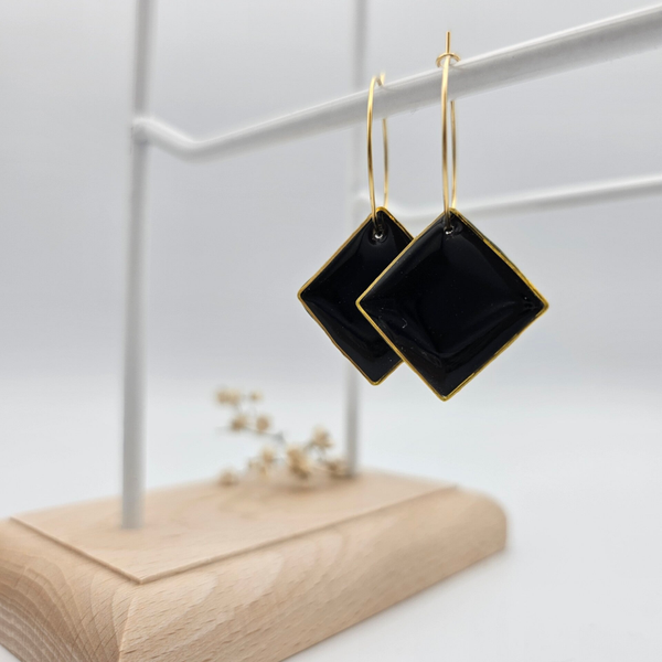 Dieses schwarze Creolenpaar ist mit einem quadratischen Charme verschmolzen und mit Resin (UV Hartz) lackiert.