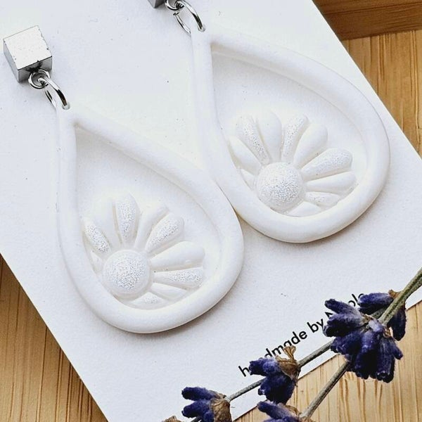 Diese Blumentropfen sind aus weißem Polymerton mit einem Perlmutschimmer.