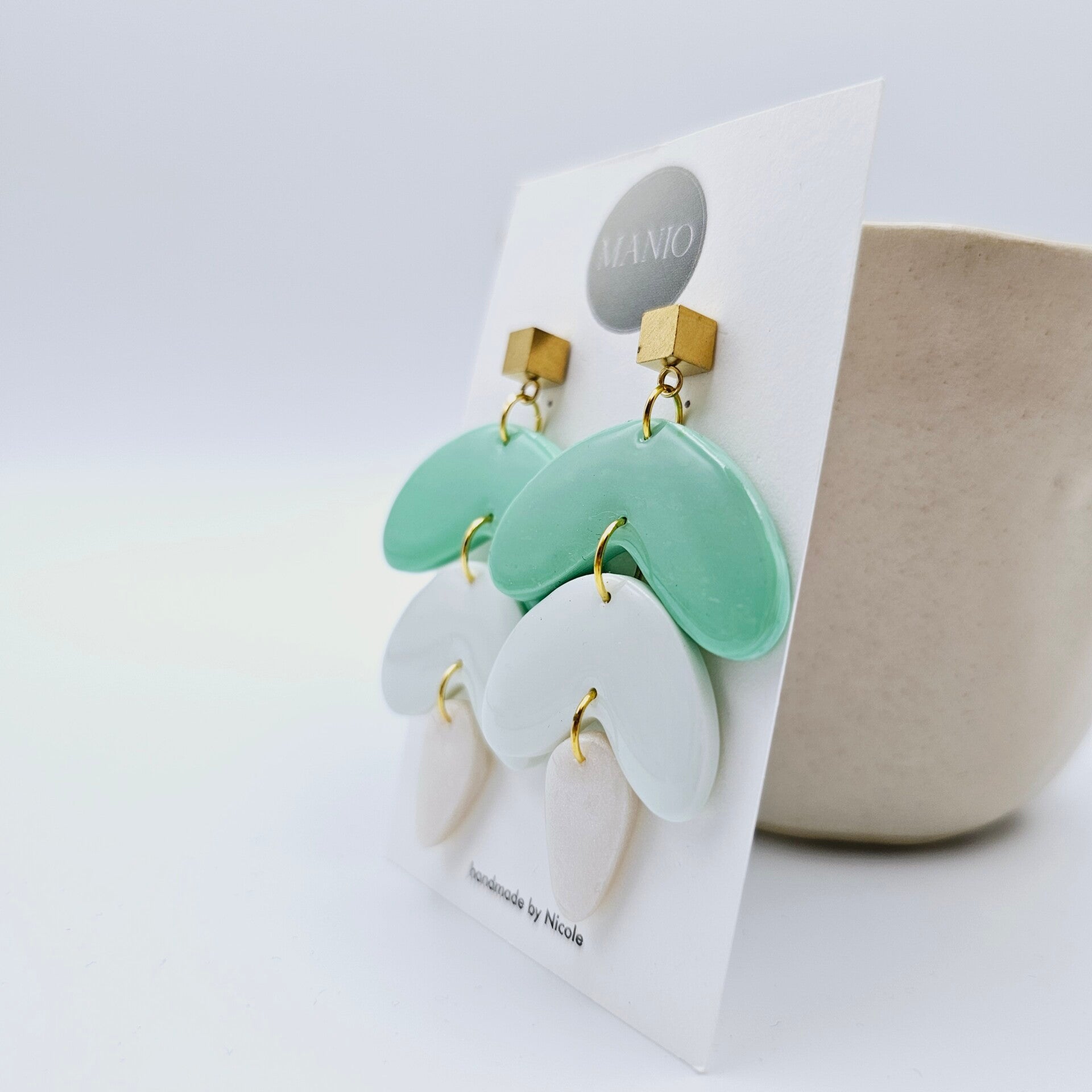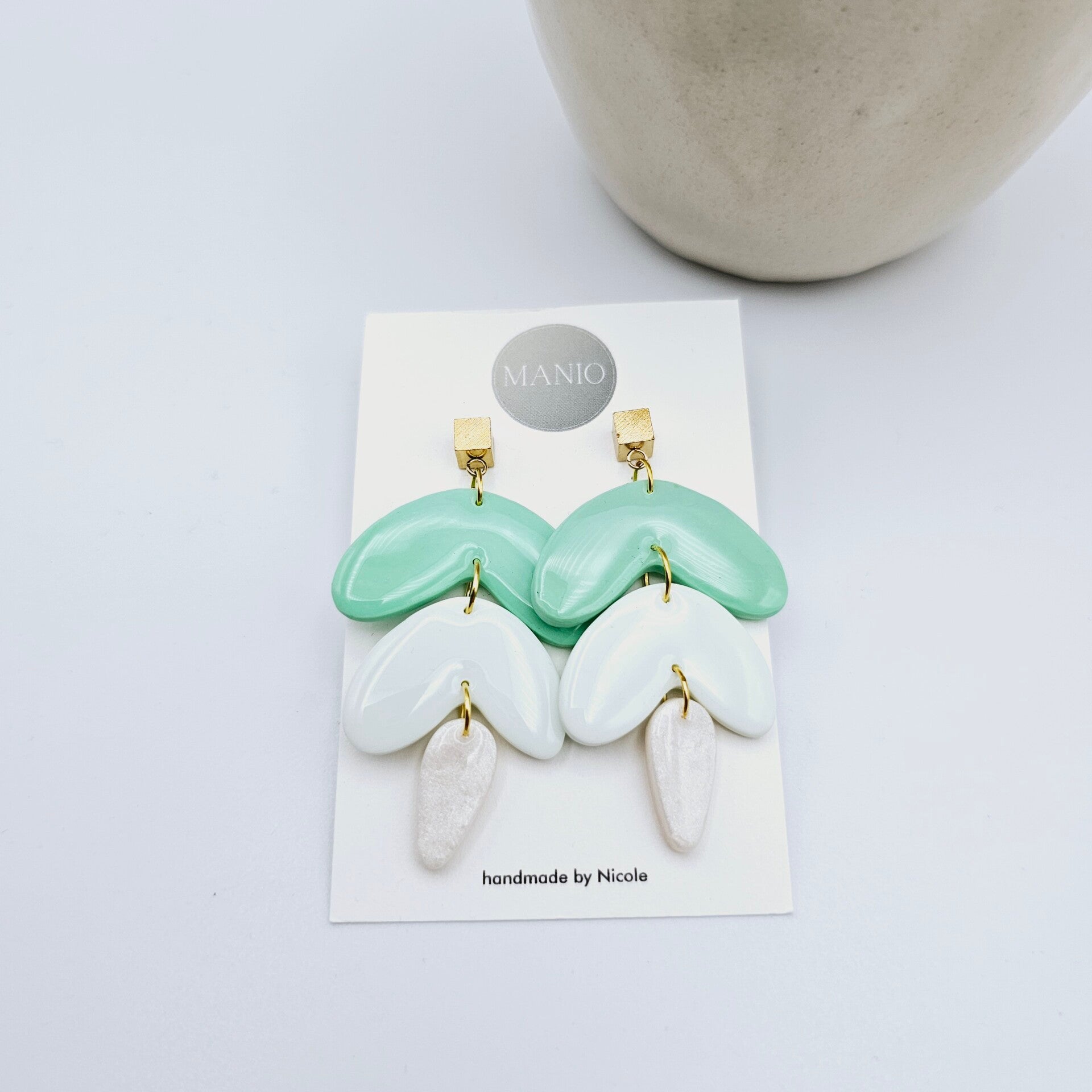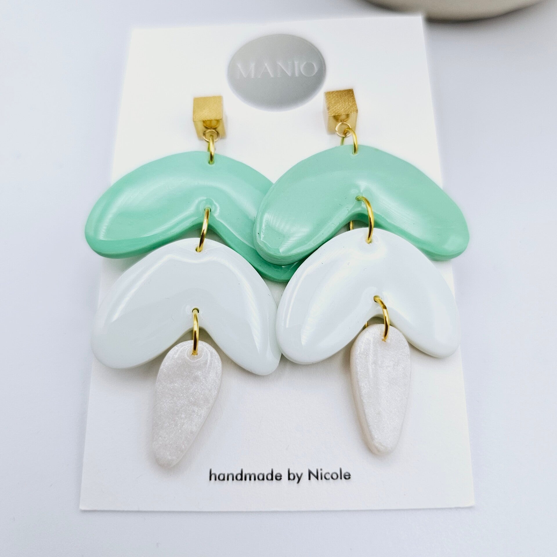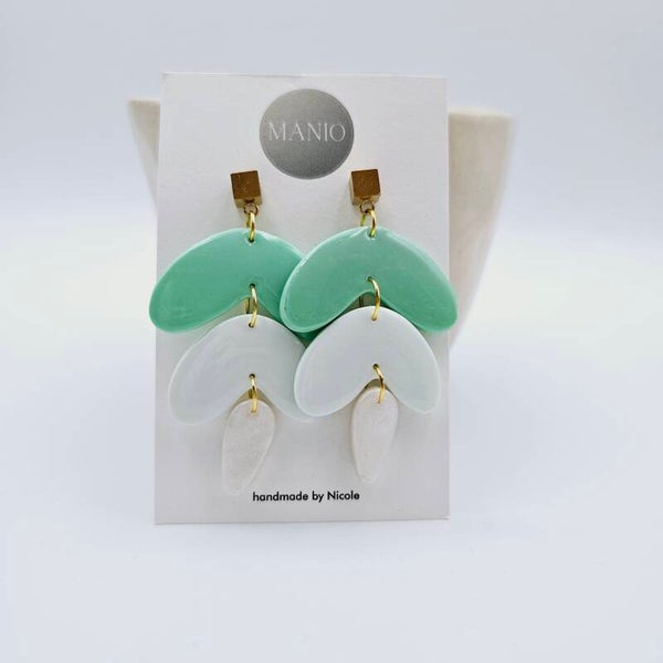 Dieses Ohrringpaar besteht aus 3 Polymerclay-Anhängern im Bohostil im Weiß/Grün Design kombiniert mit vergoldeten Würfel-Ohrsteckern