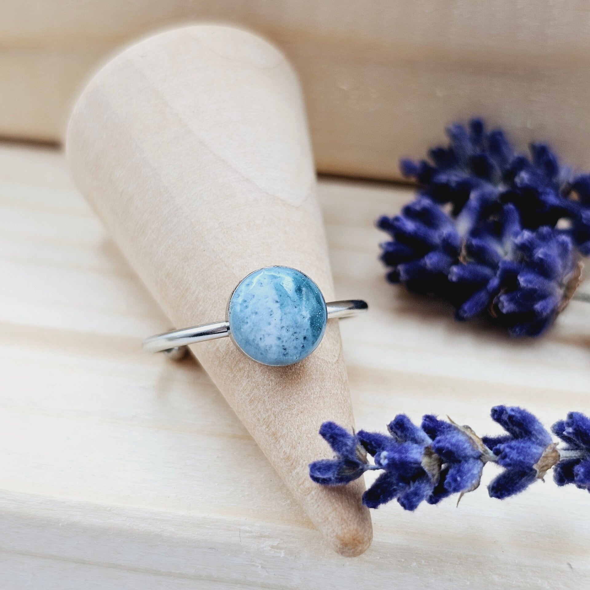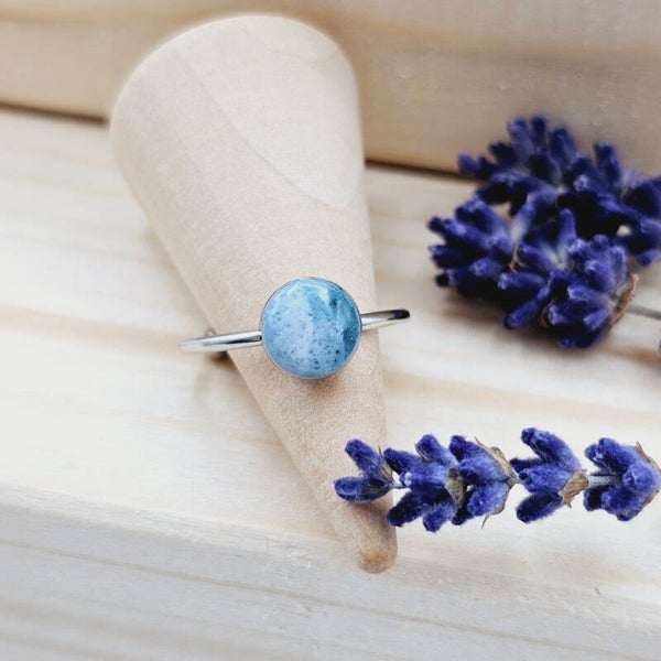 Silberfarbener Ring mit einem blauen Fimo Design.