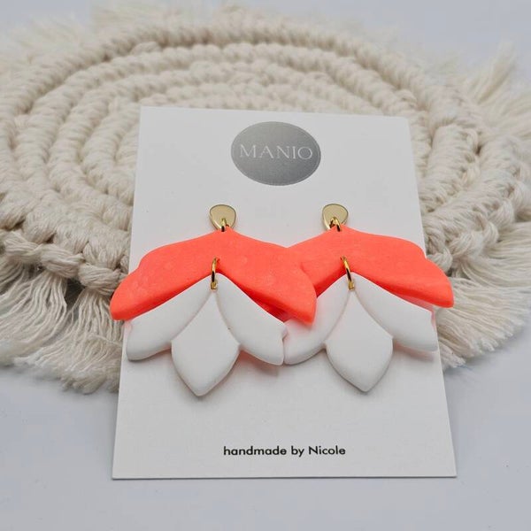 Dieses Ohrringpaar besteht aus 2 Polymerclay-Anhängern im Bohostil im Weiß/NEON-Orange Design kombiniert mit vergoldeten Tropfen-Ohrsteckern.