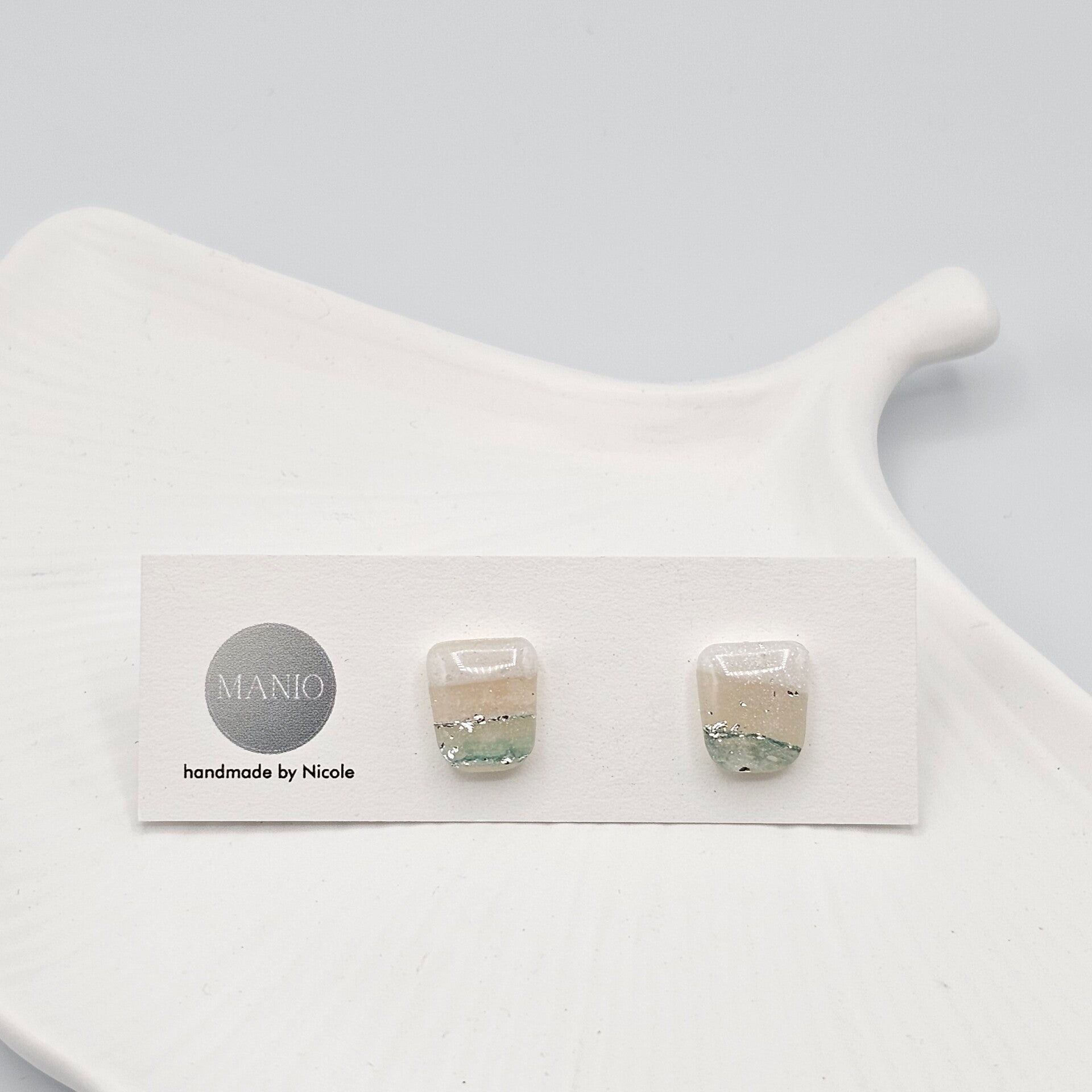 - Polymerclay in den Farben Weiß, helgrün verfeinert mit transparentem Polymerclay und Silberfolie-Flocken
