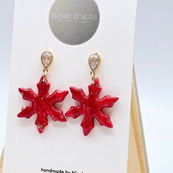 - Die Sterne sind aus verschiedenen Rottönen verziert mit Goldfolie-Flocken. Der Glitzerstecker rundet das edle Design ab. Den Glanz erhalten die Ohrringe durch das UV Hartz.