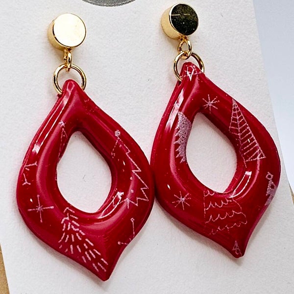 Rote Weihnachtsohrringe mit Aufdruck und Goldsteckern.