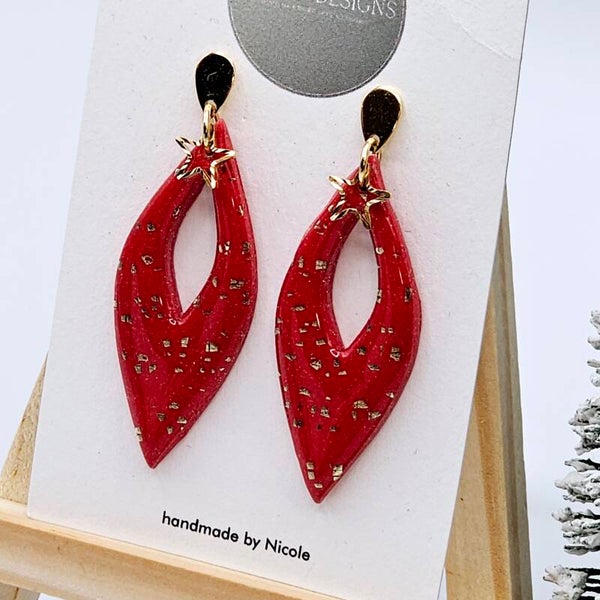 - Die Ohrringe bestehen aus roten Fimo-Anhängern und Goldfolie-Flocken, verziert ist der Ohrring mit einem Stern-Charm.
