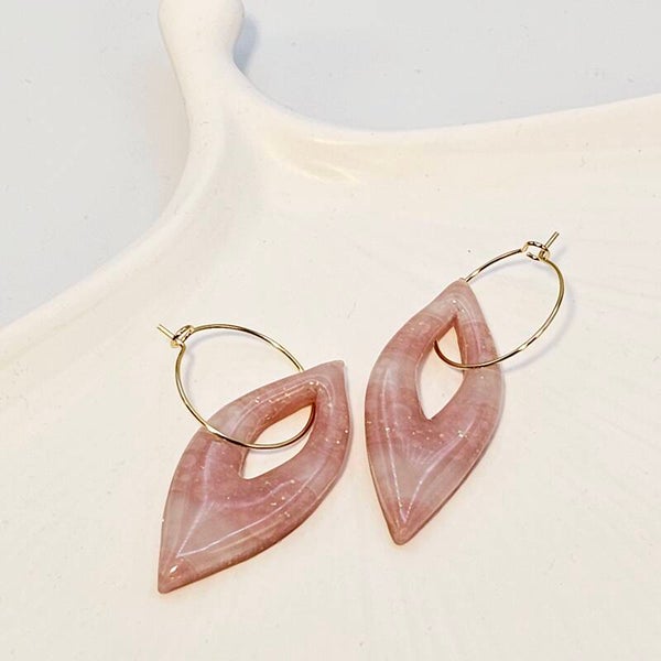 - Die Ohrringe bestehen aus transparentem und rosafarbenem Fimo, mit leichtem Goldfolieflockenschimmer.