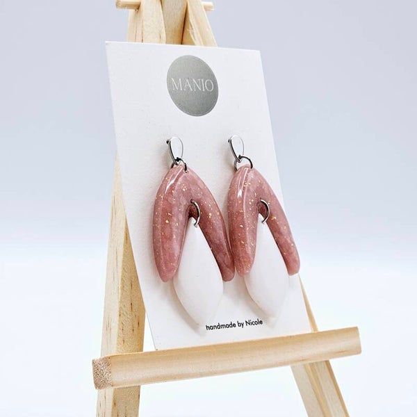 Ohrringe mit 2 Fimo-Anhängern in Rosa/Weiß- Silber und Goldfolie-Flocken Akzent.