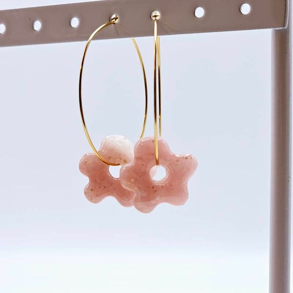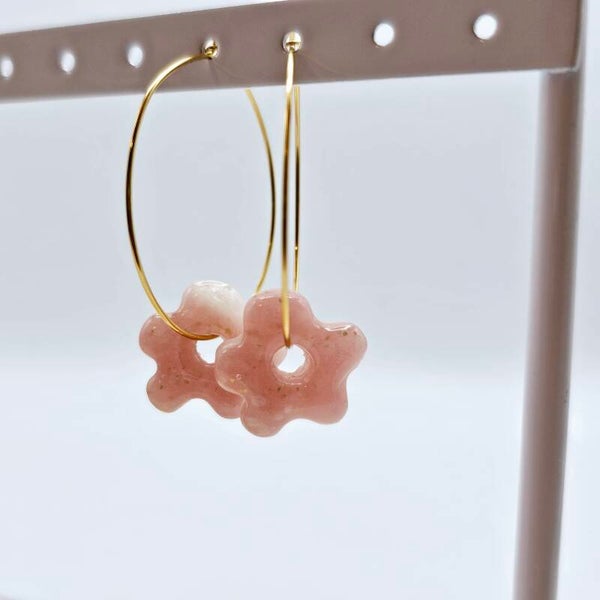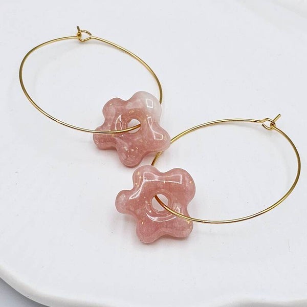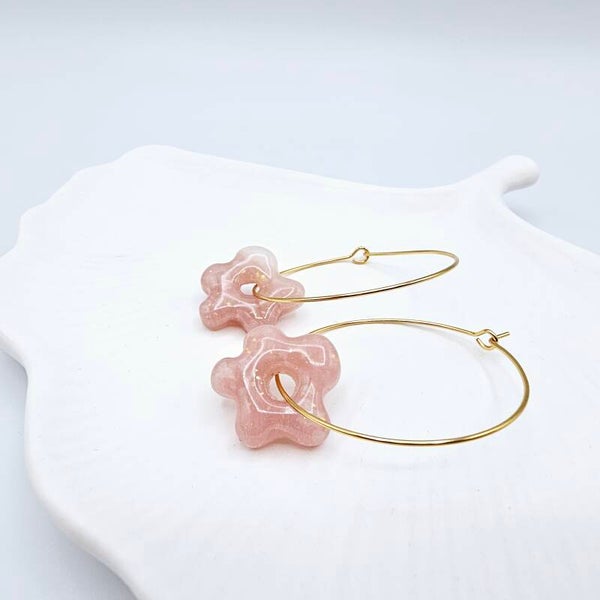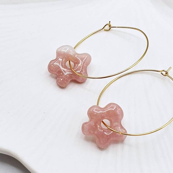 - Die Ohrringe bestehen aus transparentem, rosafarbenem Fimo. Zusätzlich habe ich hier Goldfolie Flocken hinzugefügt, welche leicht schimmern.