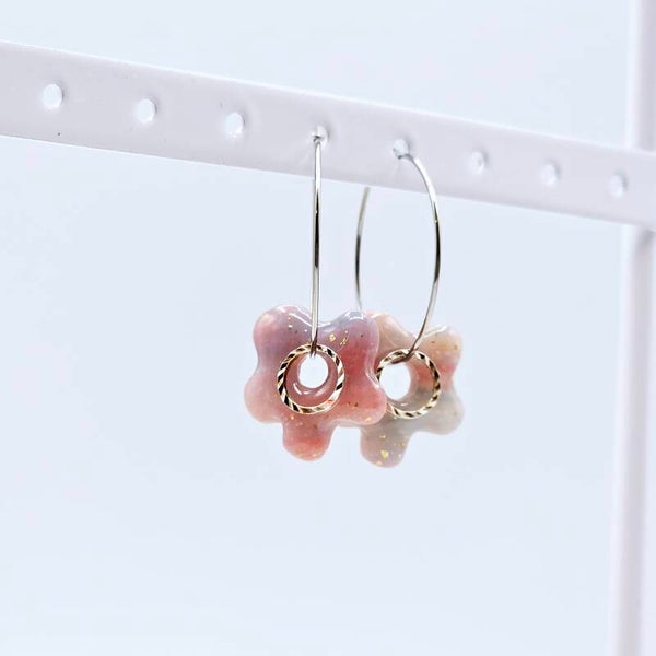 - Die Ohrringe bestehen aus transparentem, rosa- & blaufarbenem Fimo. Zusätzlich habe ich hier Goldfolie Flocken hinzugefügt, welche leicht schimmern.