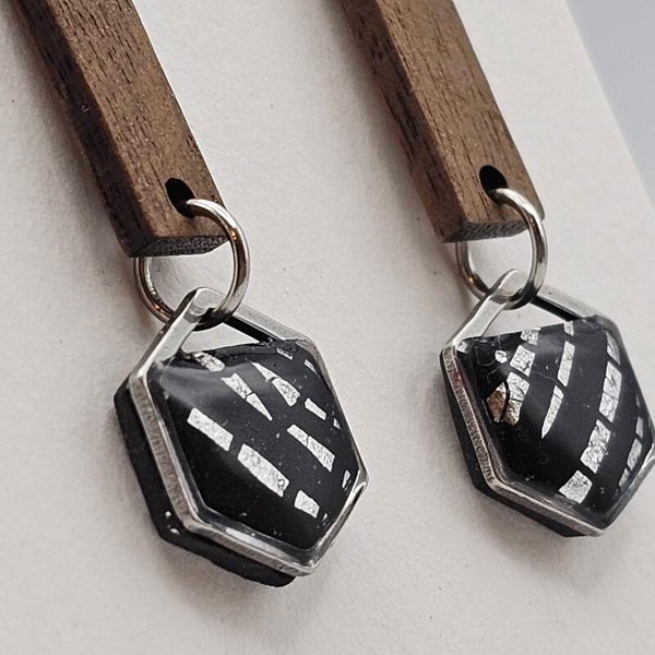 Hexagon Ohrring Schwarz/Silber mit Holz-Ohrstecker.
