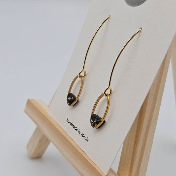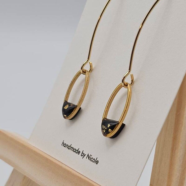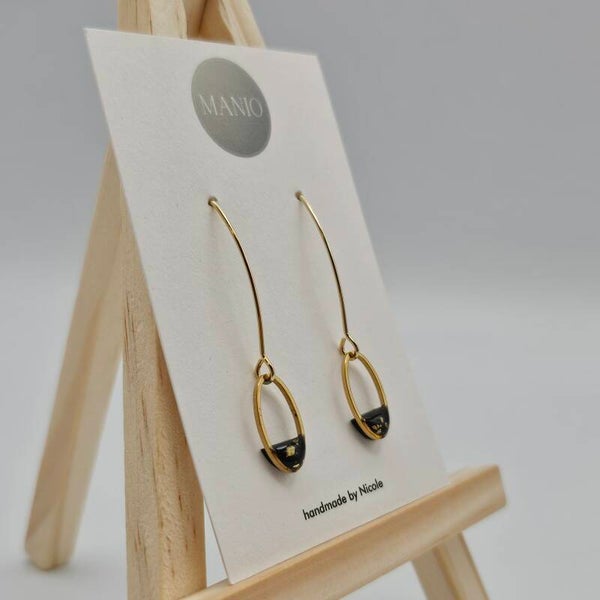 - Die Ohrringe bestehen aus schwarzem Fimo, mit Goldfolie-Flocken, den Glanz erhalten die Ohrringe durch das UV Hartz.