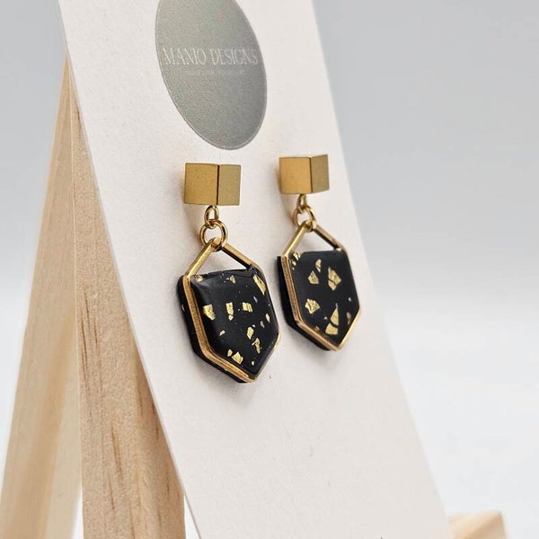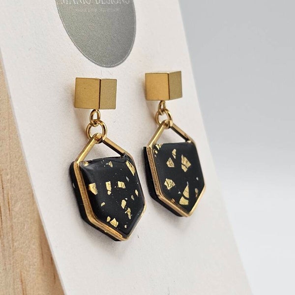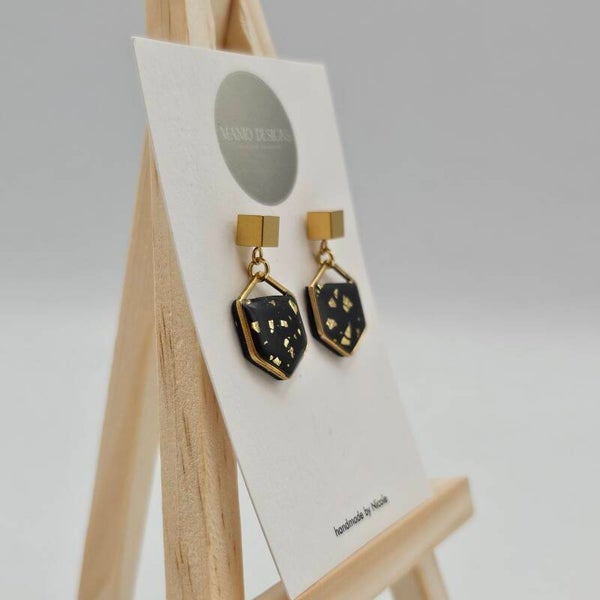 - Die Ohrringe bestehen aus schwarzem Fimo, mit Goldfolie-Flocken, den Glanz erhalten die Ohrringe durch das UV Hartz.