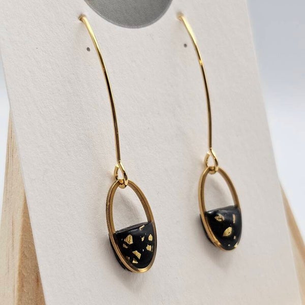 Lange ovale Tropfen Ohrringe Schwarz/Gold.