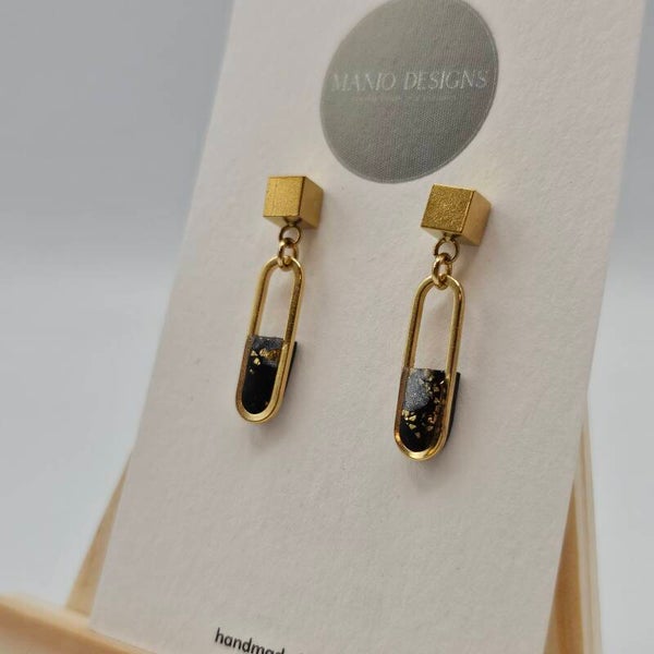 Ovale Charm-Anhänger verschmolzen mit schwarzem Fimo & Goldfolie-Flocken verziert.