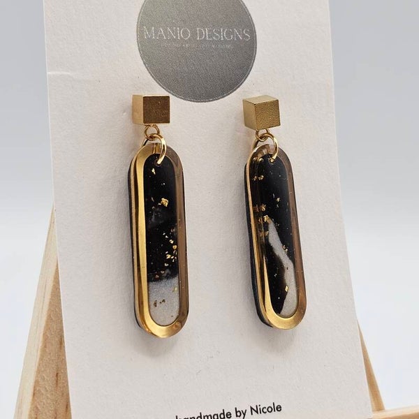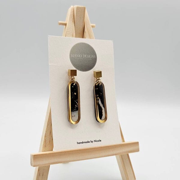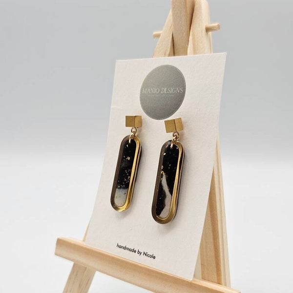 - Die Fimo-Anhänger erhalten den Glanz durch das UV Hartz und sind mit Goldfolie-Flocken verziert. Zusätzlich zum schwarzem Fimo habe ich auch weißen Effect-Fimo genutzt, dadurch erhält der Ohrring einen schönen Schimmer.