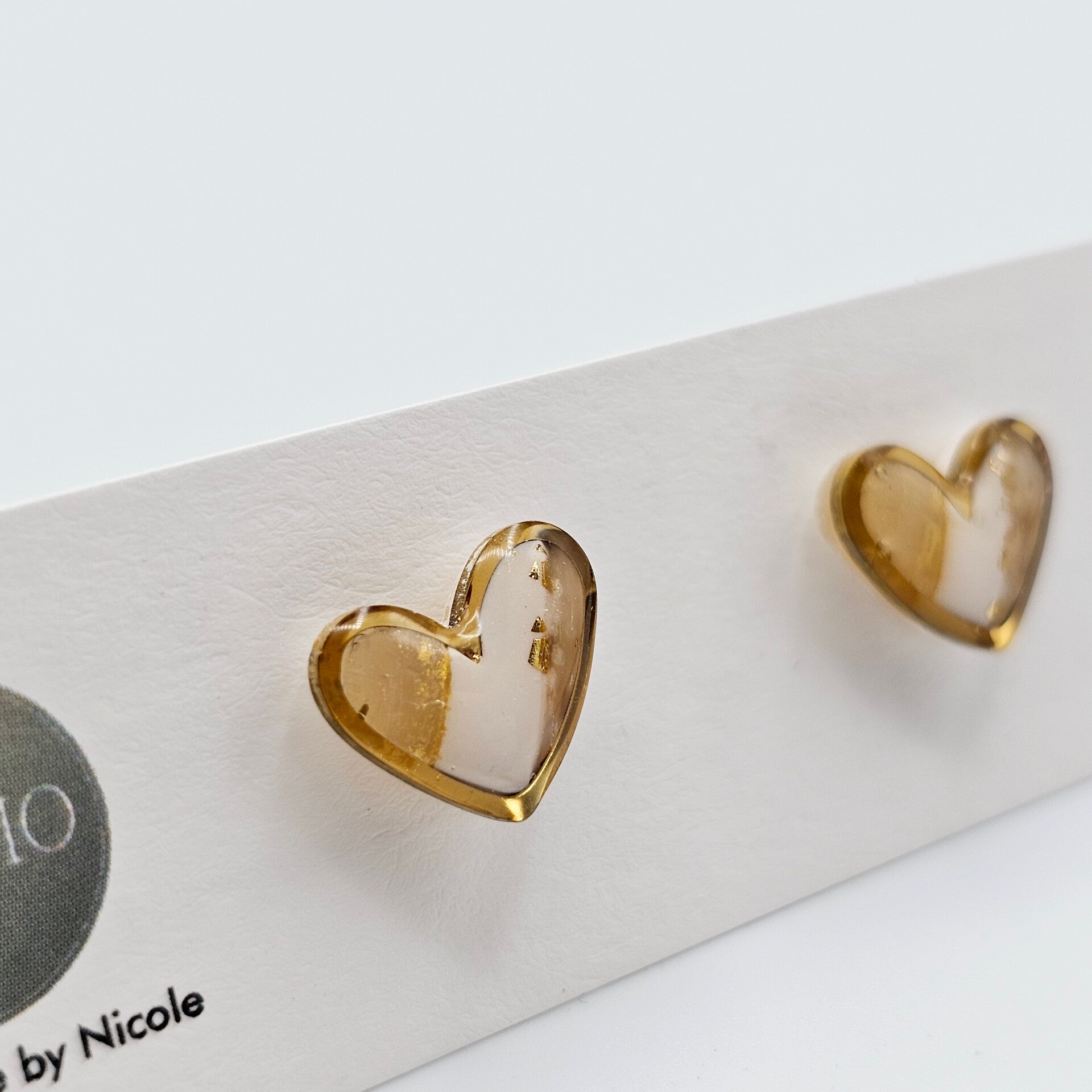 - Herz Ohrstecker aus transparentem und weißem Fimo verziert mit Goldfolieflocken.