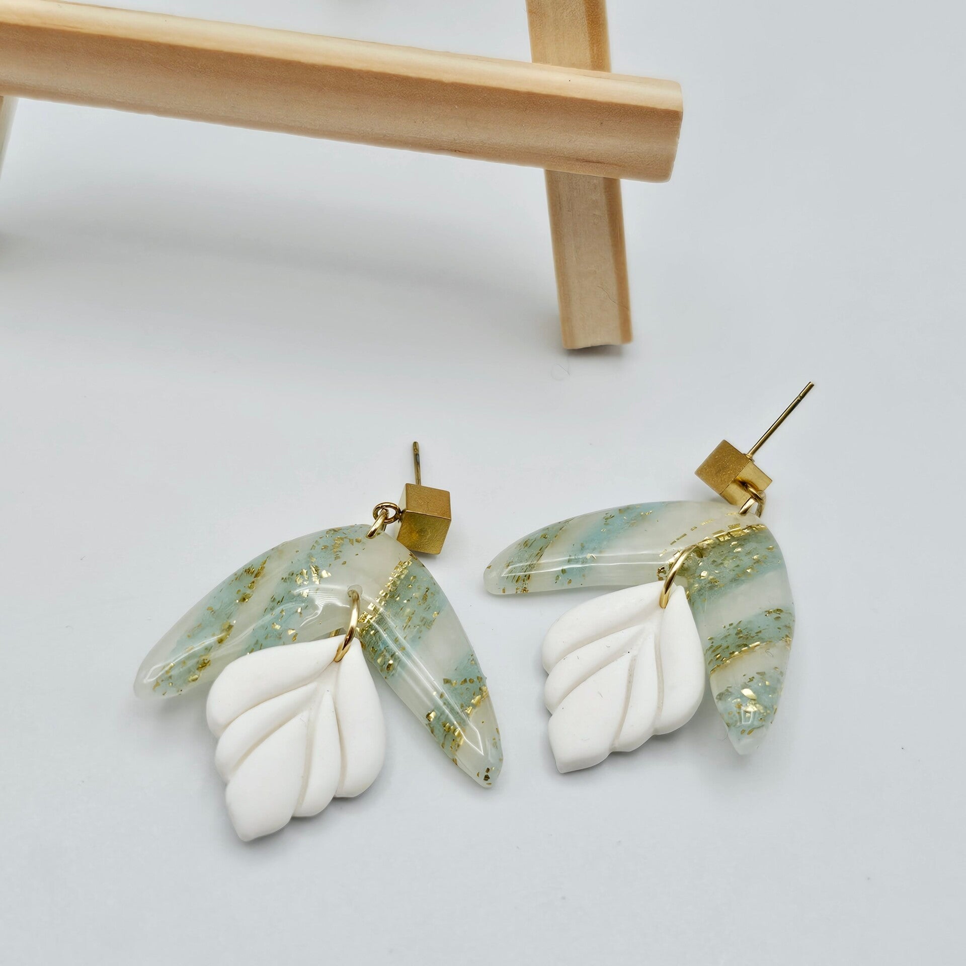 - Die Ohrringe bestehen aus 2 Fimo-Anhängern. Einer ist aus transparentem & grünem Fimo mit Goldfolie-Flocken, den Glanz erhält dieser durch das UV Hartz. Ein Anhänger ist aus weißem Fimo.