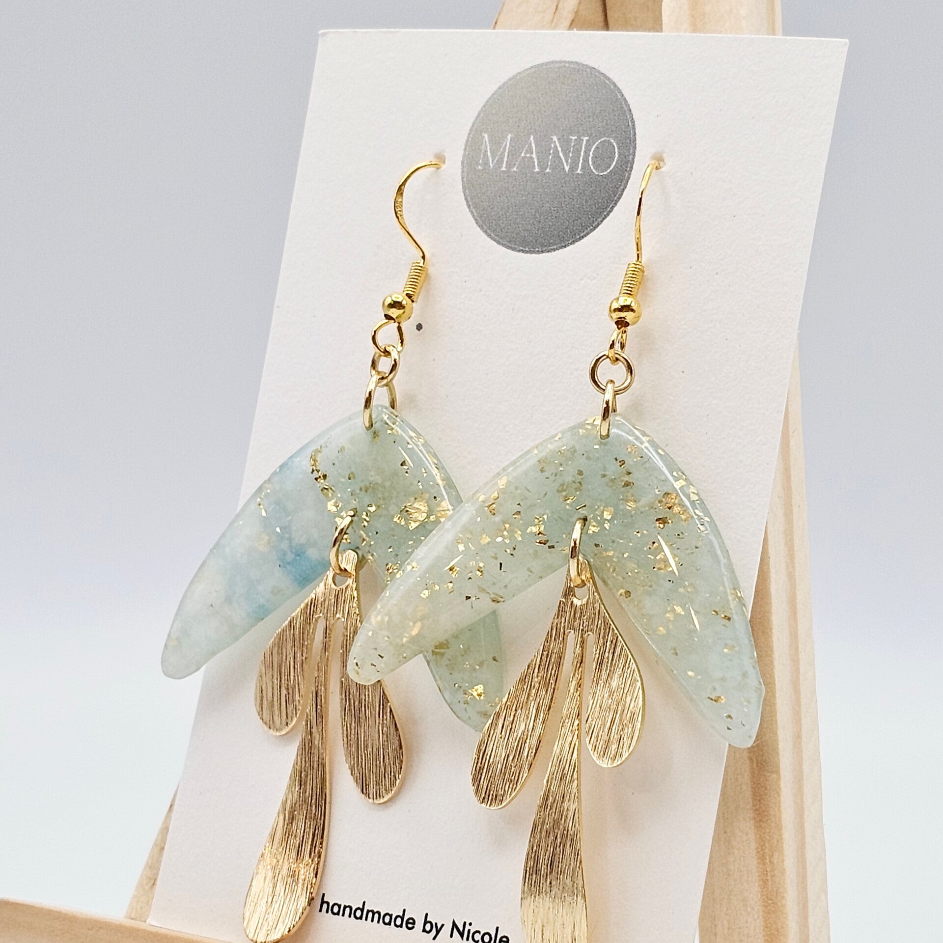 - Die Ohrringe bestehen aus 2 Anhängern. Einer ist aus transparentem & grünem Fimo mit Goldfolie-Flocken, den Glanz erhält dieser durch das UV Hartz und 1 Anhänger ist aus vergoldetem Edelstahl.
