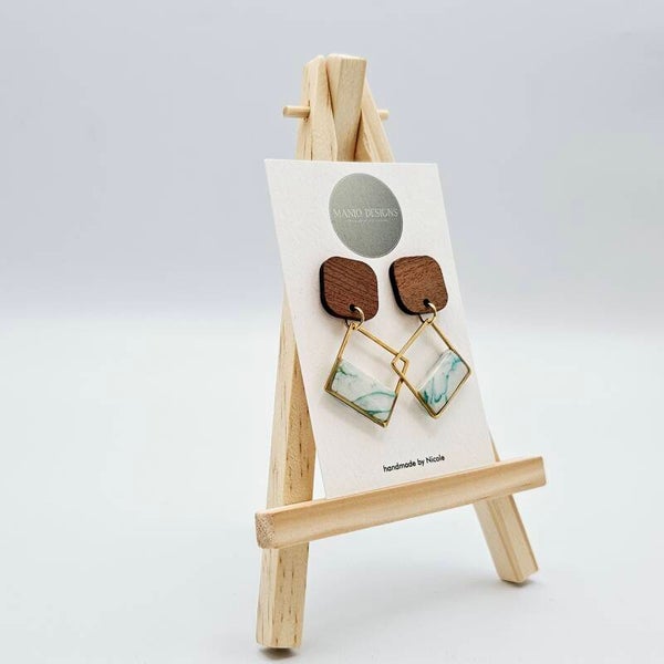 - Die Fimo-Anhänger in Weiß/Grün/Blau verschmolzen mit Goldfolie-Flocken, erhalten den Glanz durch das UV Hartz.