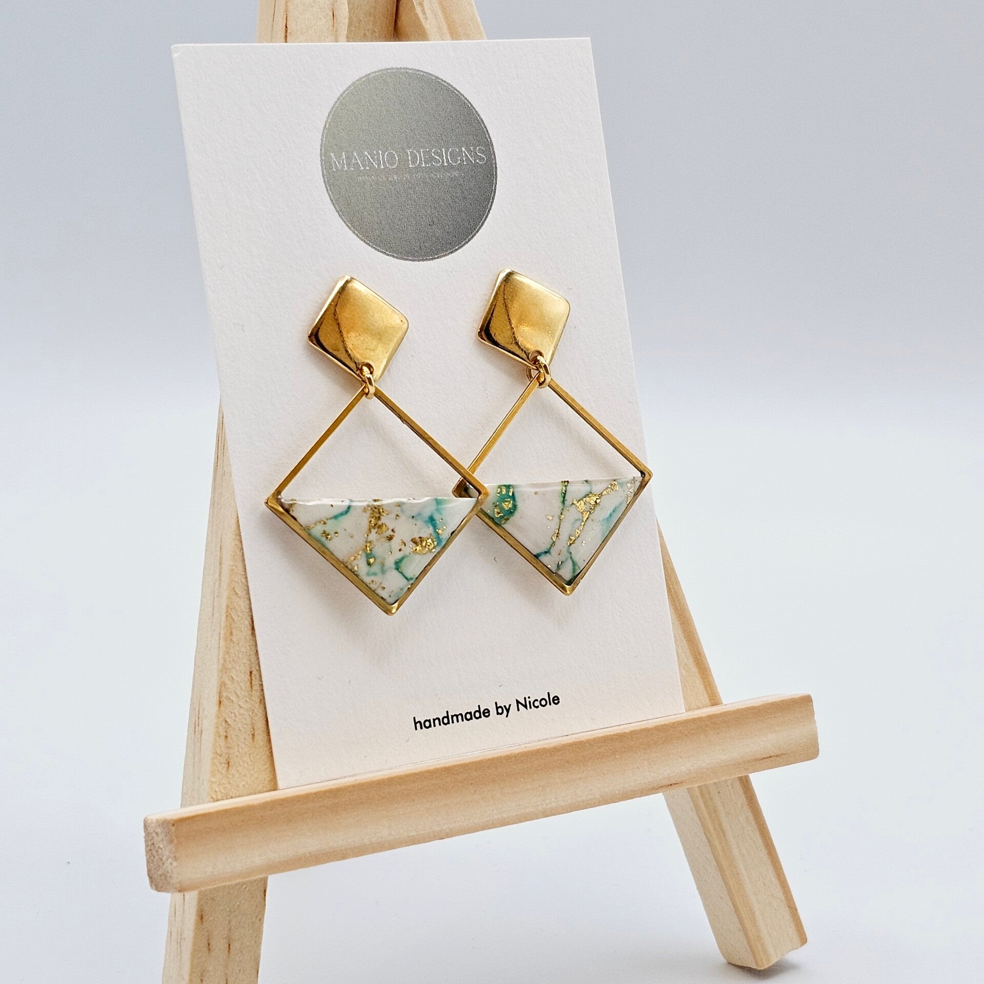 - Die Fimo-Anhänger in Weiß/Grün/Blau verschmolzen mit Goldfolie-Flocken, erhalten den Glanz durch das UV Hartz.