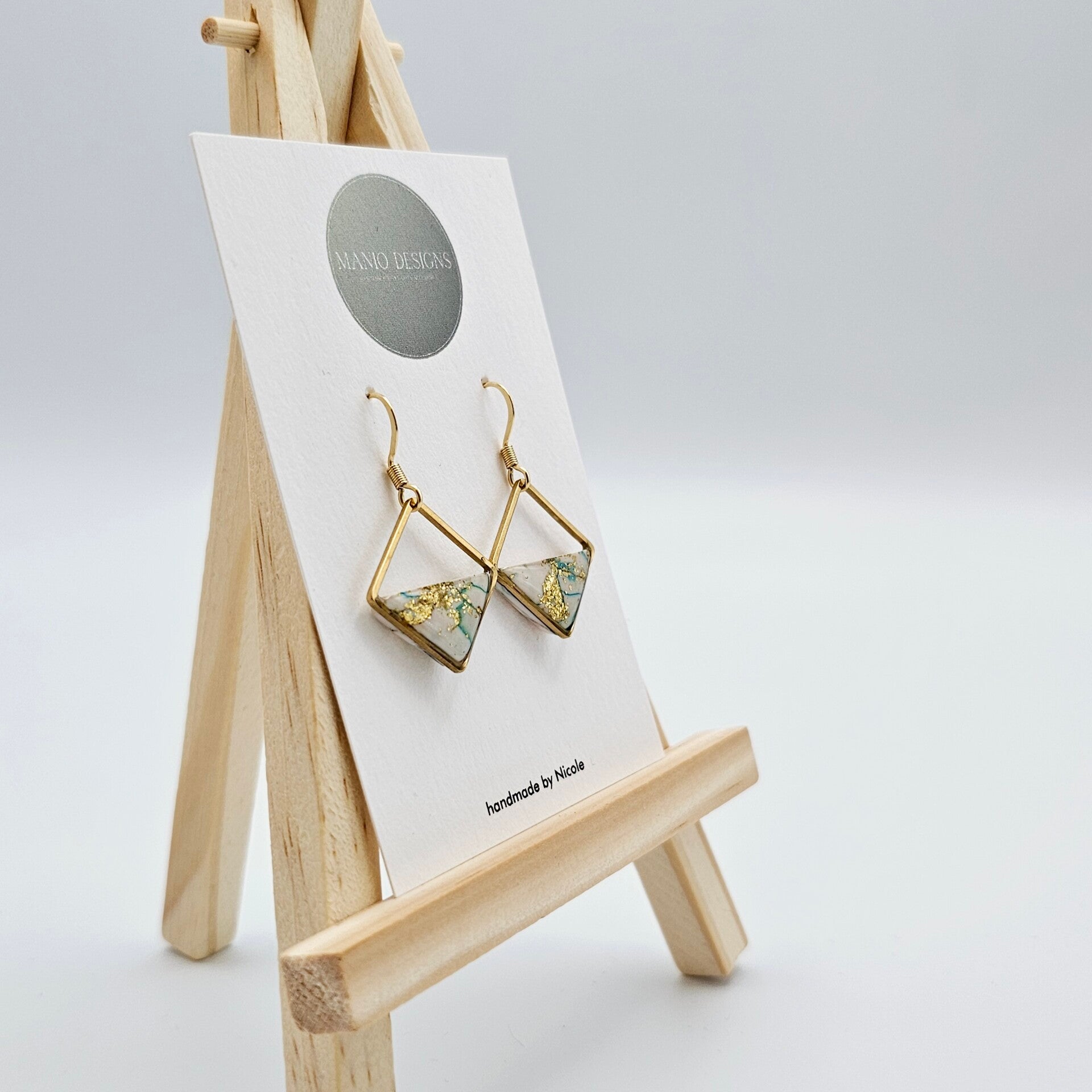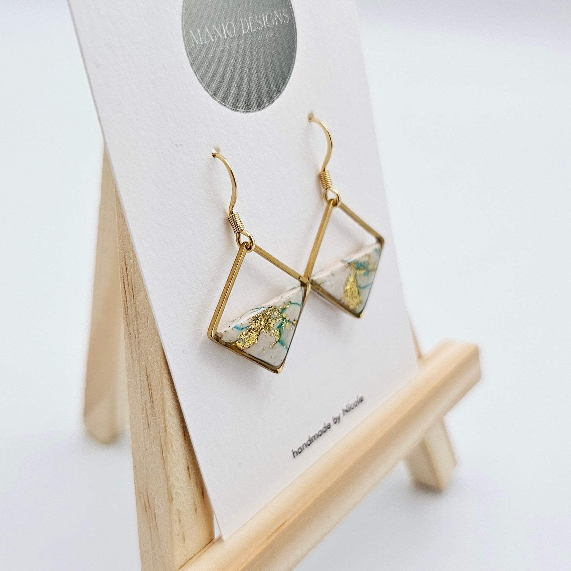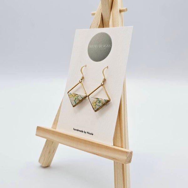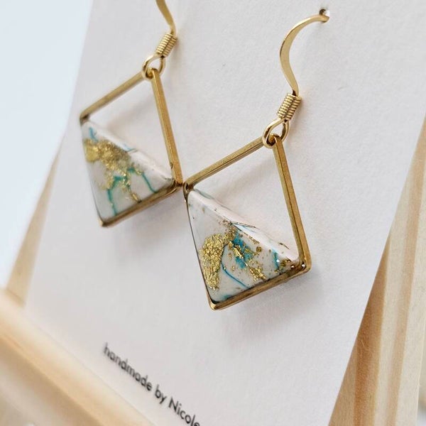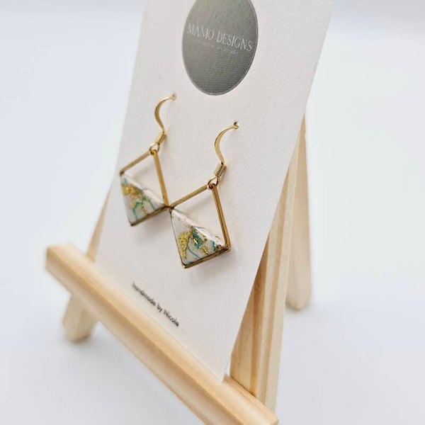 - Die Fimo-Anhänger in Weiß/Grün/Blau verschmolzen mit Goldfolie-Flocken, erhalten den Glanz durch das UV Hartz.