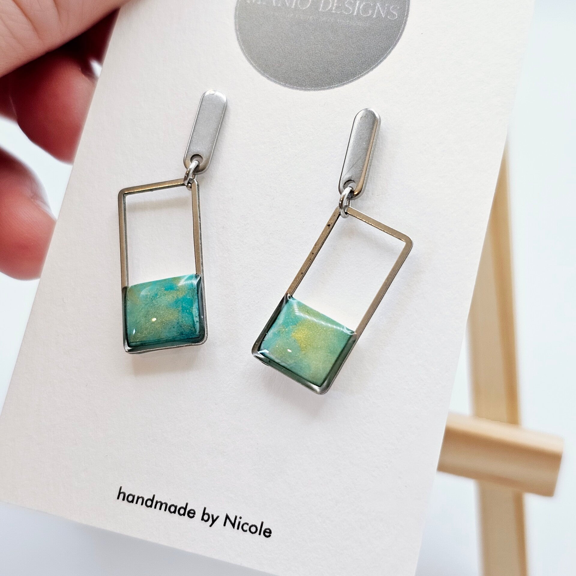 - Die Fimo-Anhänger in Rechteckige Ohrringe Grün/Gold erhalten den Glanz durch das UV Hartz.