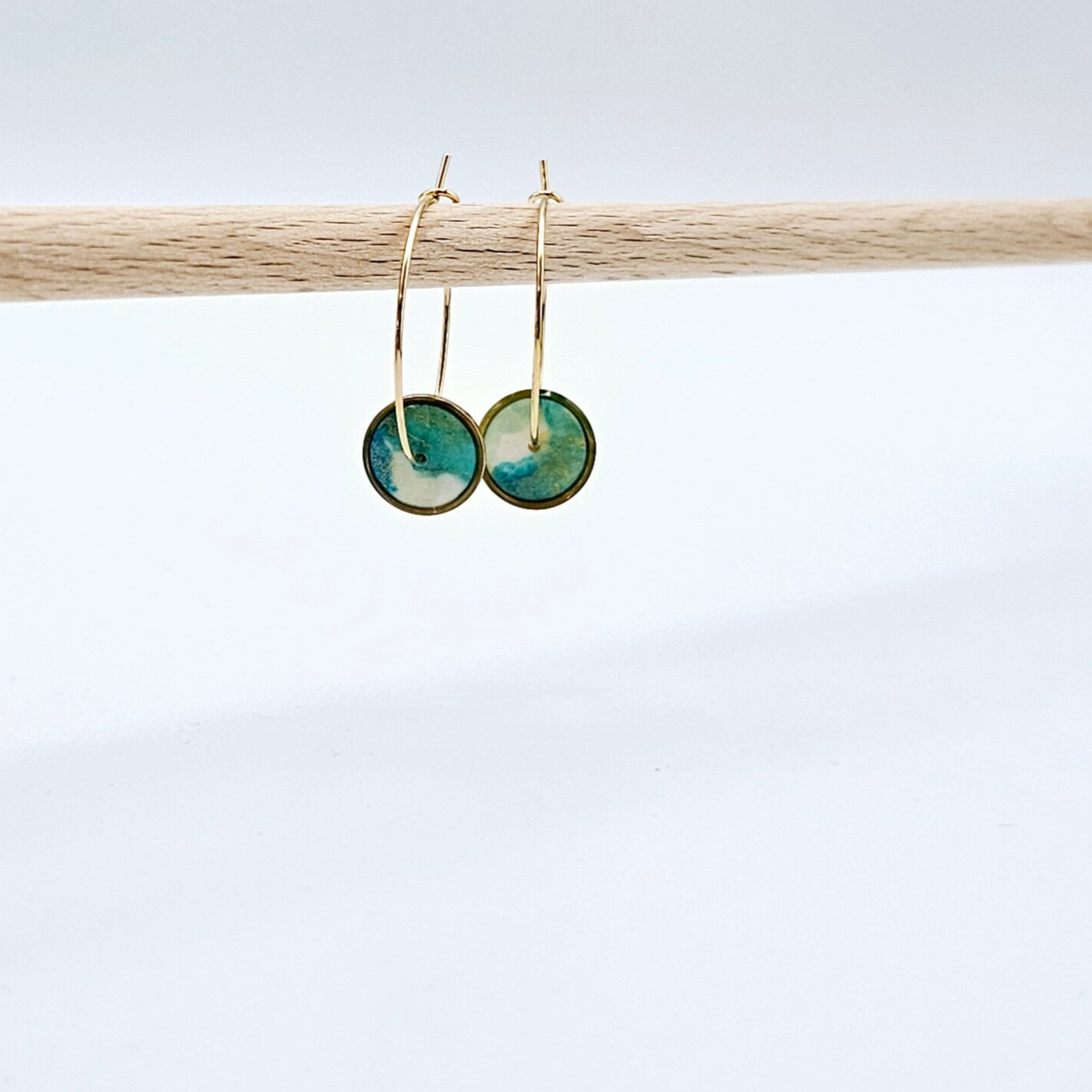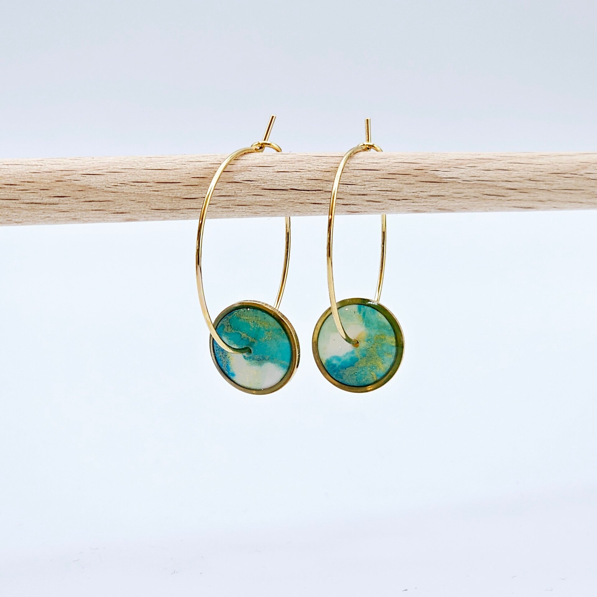 - Die Fimo-Anhänger in Grün/Blau mit Weiß- & Goldschimmer erhalten den Glanz durch das UV Hartz.