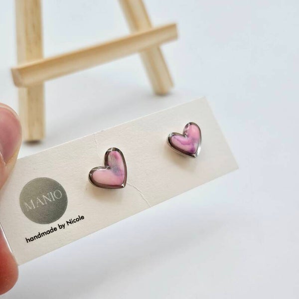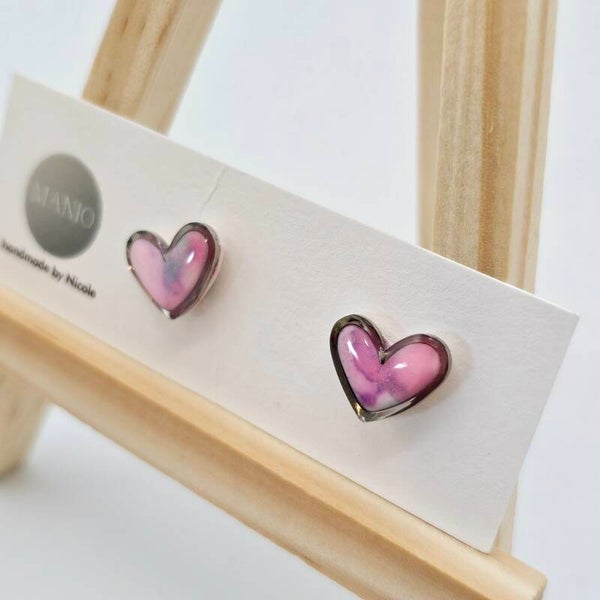 - Die Herz-Ohrstecker sind aus Rosa/Lila Fimo mit Silberschimmer & erhalten den Glanz durch das UV Hartz.