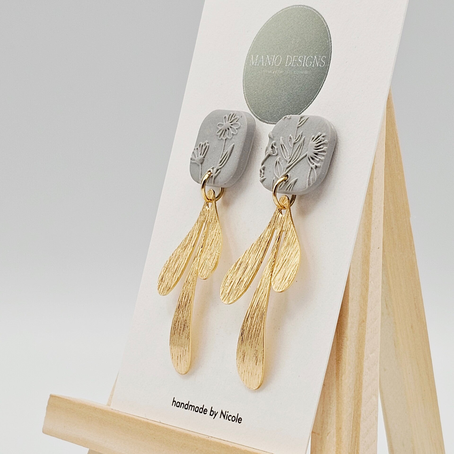 - Die Ohrstecker sind aus grauem Fimo mit Blumenprägung und vergoldetem Edelstahlstecker.