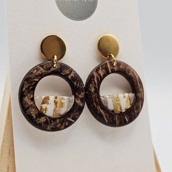 Bei diesen Ohrringen ist das Fimo in Weiß/Gold & Transparent, welcher mit dem Holz-Anhänger verschmolzen ist.