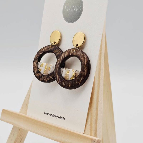 Ohrringe in Weiß/Gold mit Holzanhänger