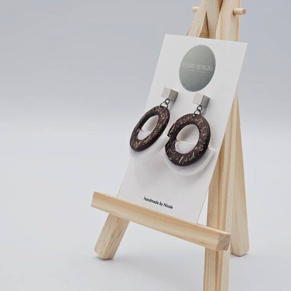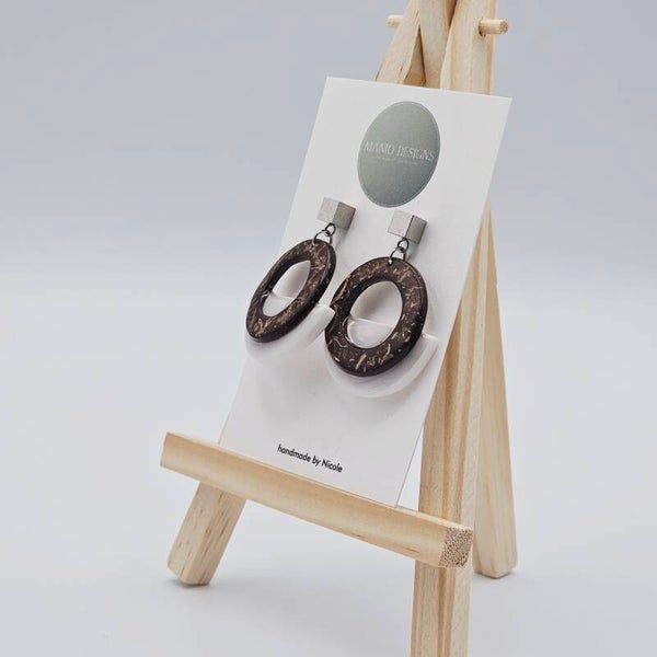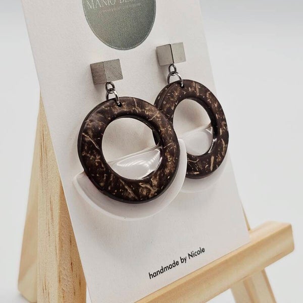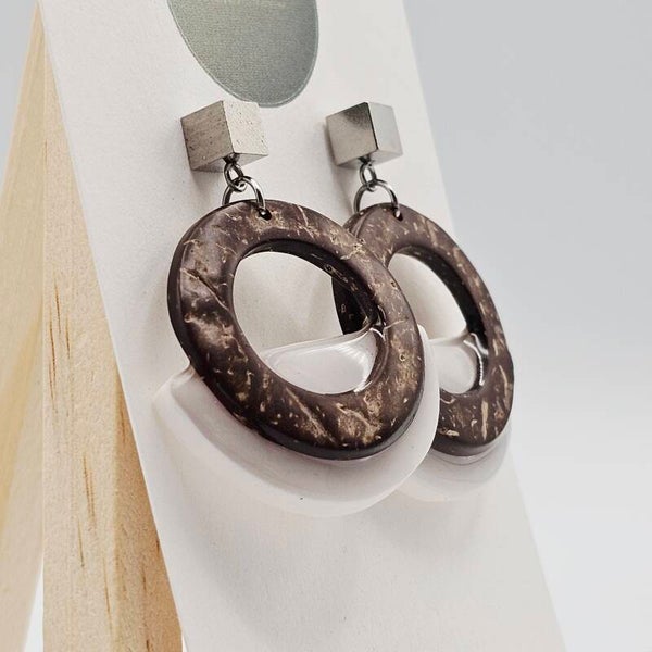 Bei diesen Ohrringen ist das Fimo in Weiß, welcher mit dem Holz-Anhänger verschmolzen ist.