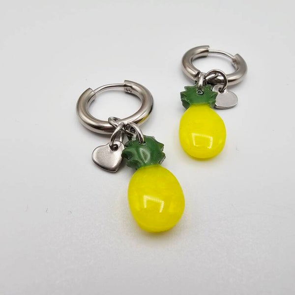 - Die Fimo-Ananasanhänger sind aus Polymerton in Grün und Gelb.