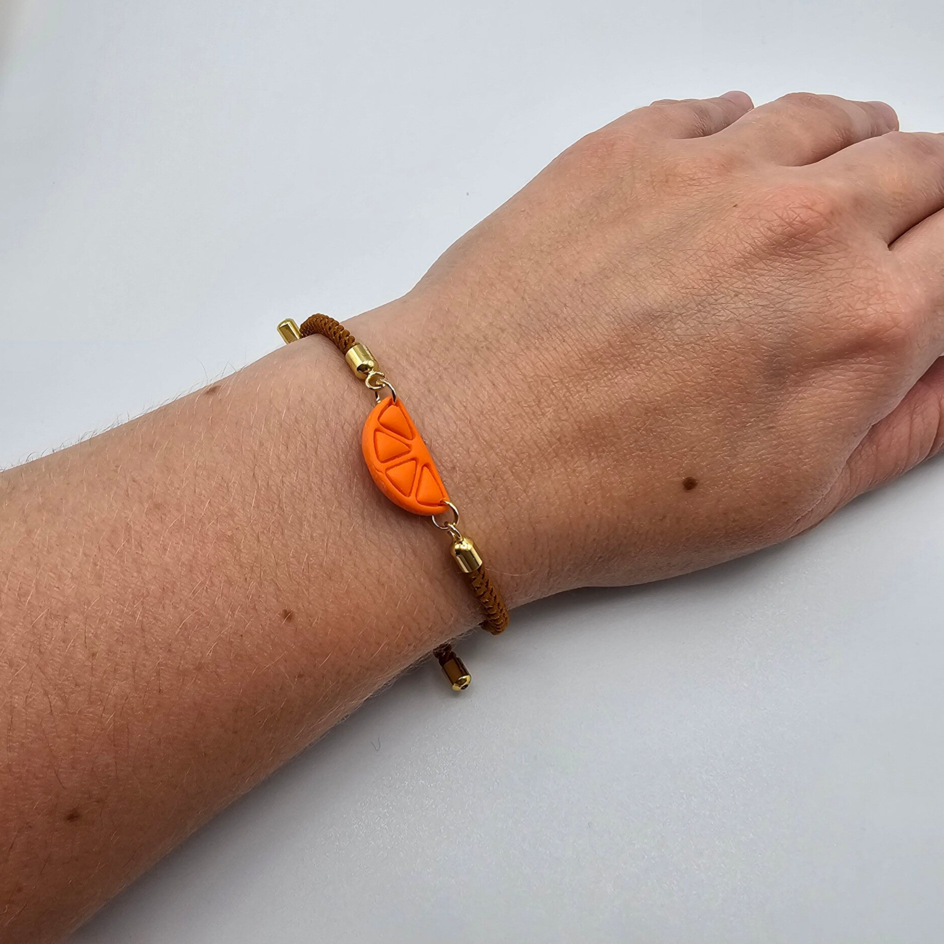 Dieses Armband ist aus einem orang-goldenem Kordelarmband mit einem Orangenanhänger aus orangenem Polymerton (Fimo).