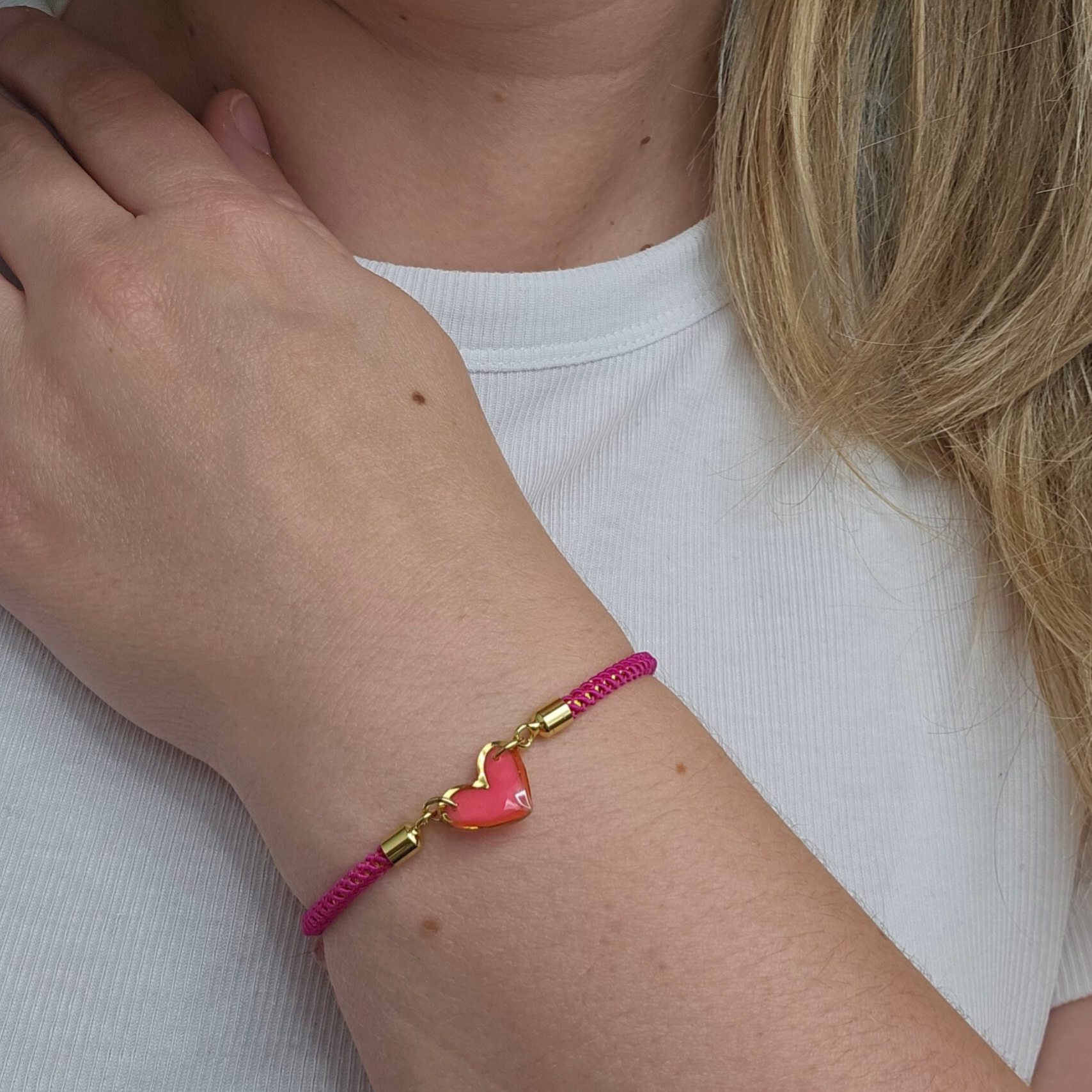 Dieses Armband ist aus einem pink/goldenem Kordelarmband und einem Herzanhänger aus pinkem Polymerton (Fimo).