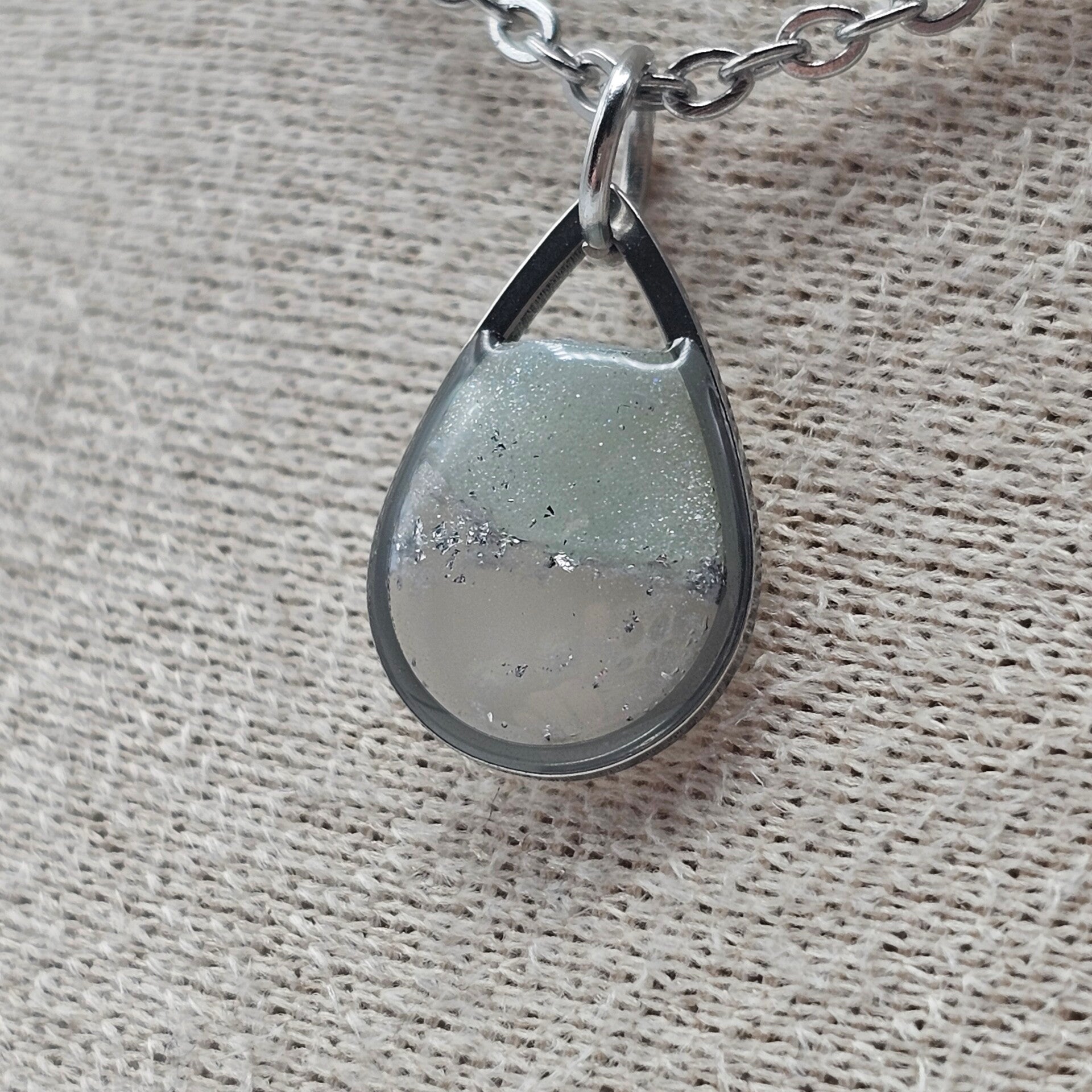 Diese Kette besticht durch den eleganten Tropfenanhänger aus transparentem und zartem Mint Polymerton mit Silberfolieflocken.