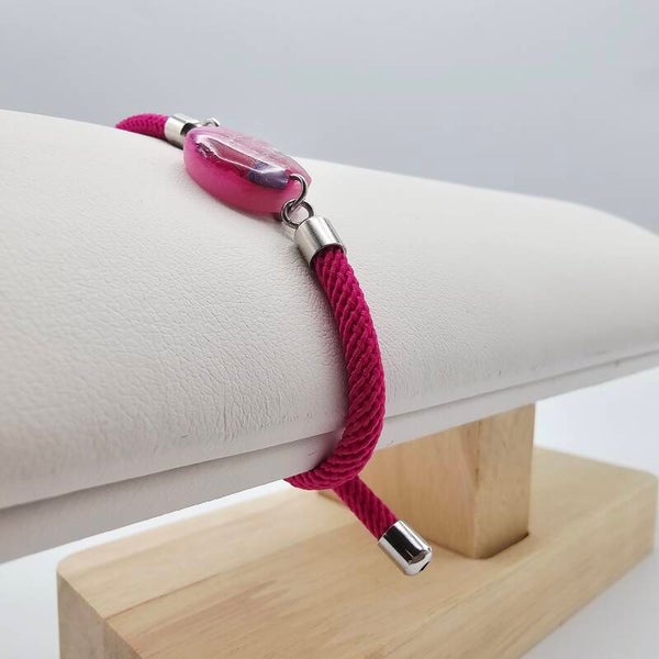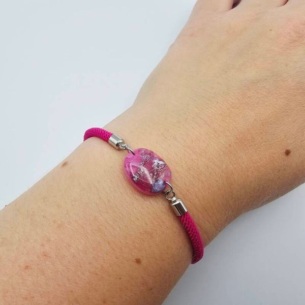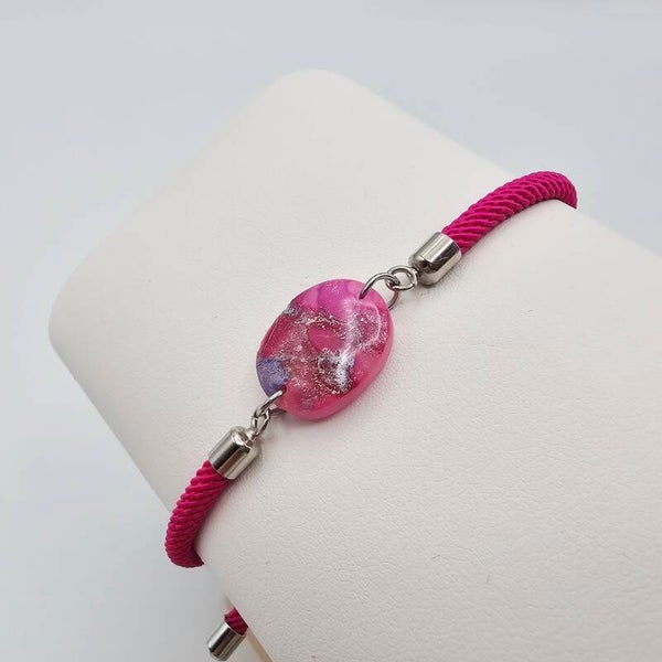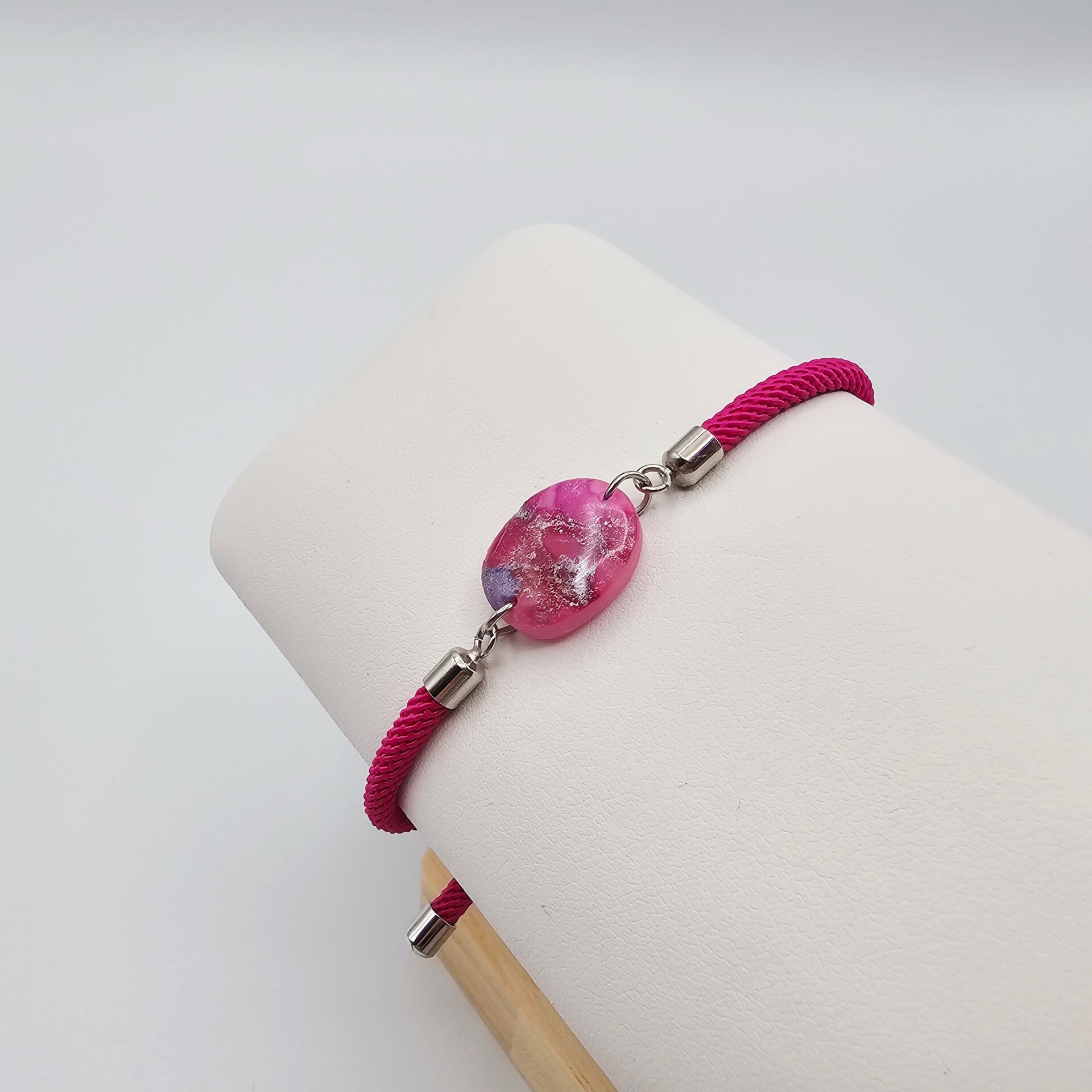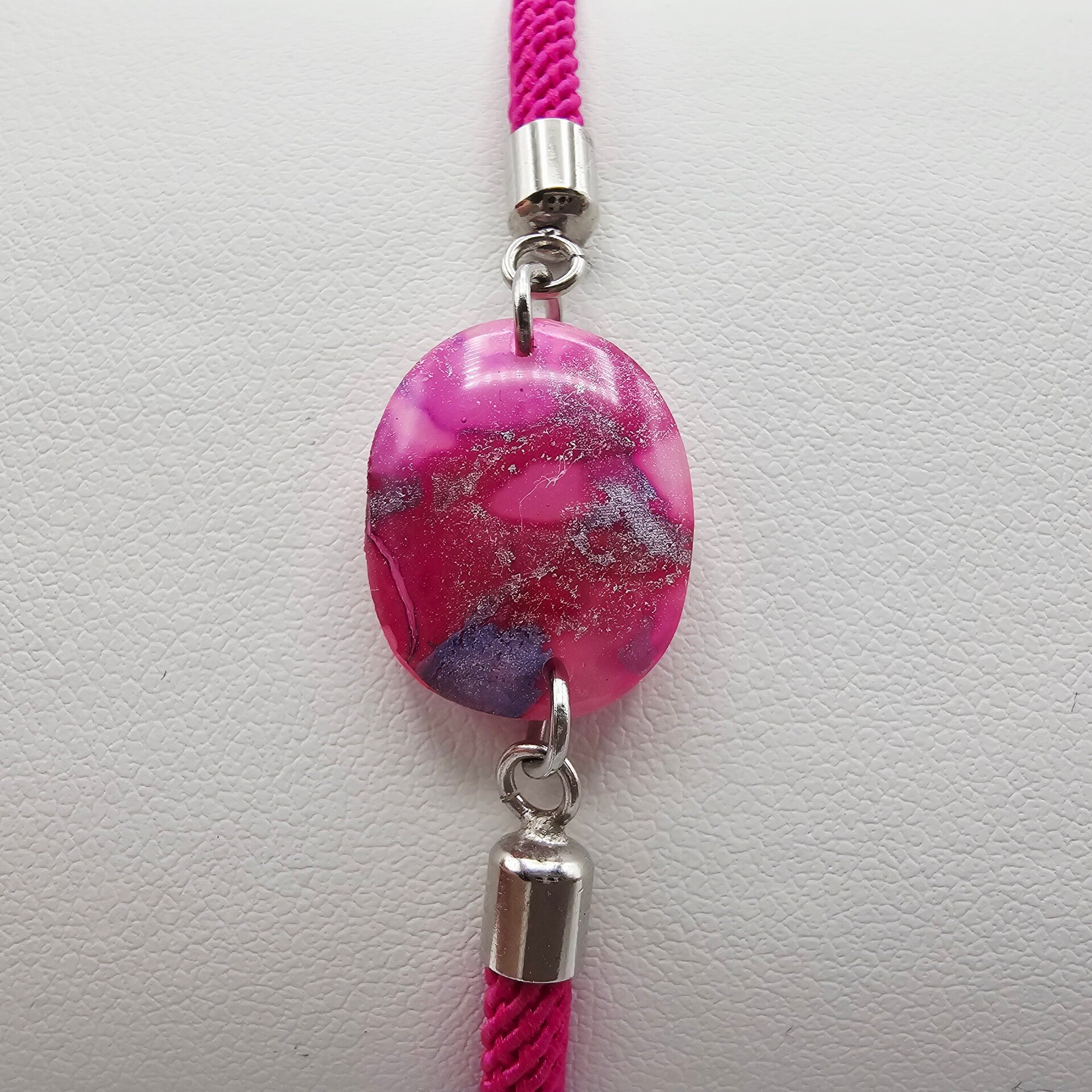 Verspielt, farbenfroh und handgemacht: Dieses zarte Armband besteht aus einer pinken Kordel mit silbernen Akzenten und einem ovalen Anhänger aus hochwertigem Polymer-Ton (Fimo). Der Anhänger besticht durch seinen pinken Grundton und wurde liebevoll mit Acrylfarben von Hand verziert.