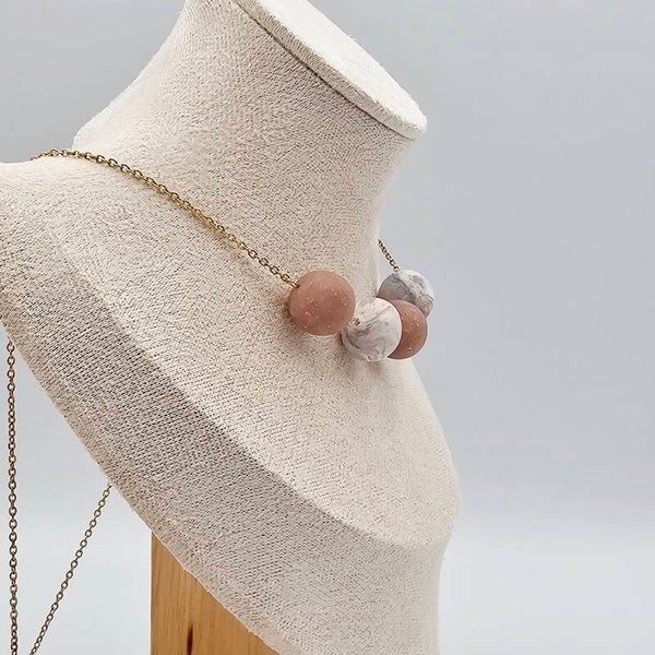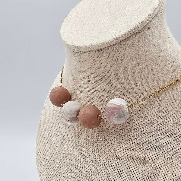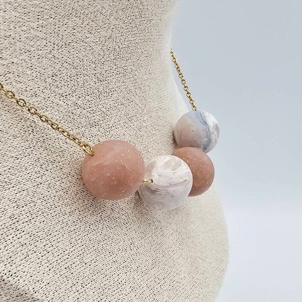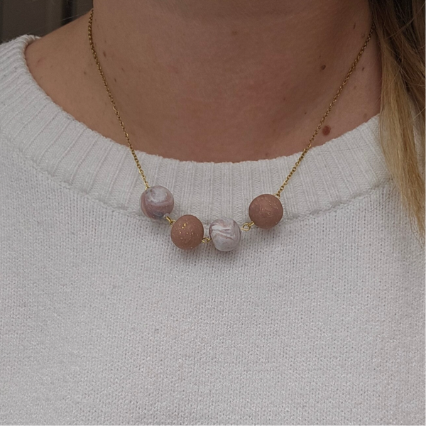 Diese besondere Kette besticht durch die vier kugelförmigen Polymertonanhänger in den verschiedenen Farben: Rosa mit Goldfolieflocken & Rosa/Weiß/Hellblau mit Goldfolieflocken.
