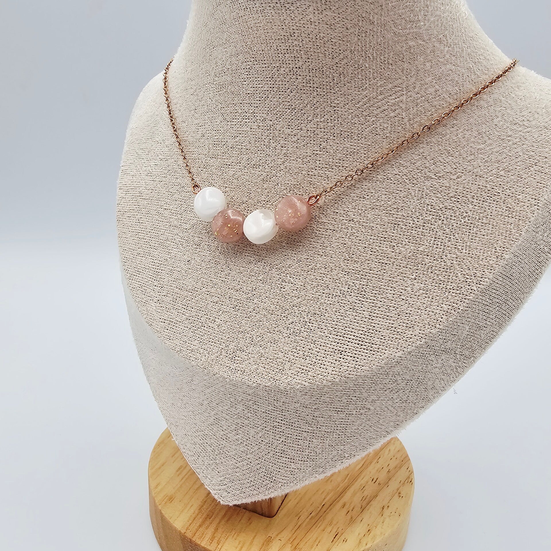 Diese besondere Kette besticht durch die vier kreisförmigen Polymertonanhänger in den Farben: Rosa mit Goldfolieflocken & Weiß/Transparent.