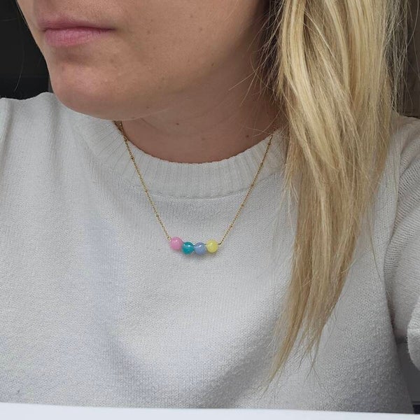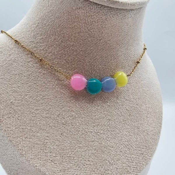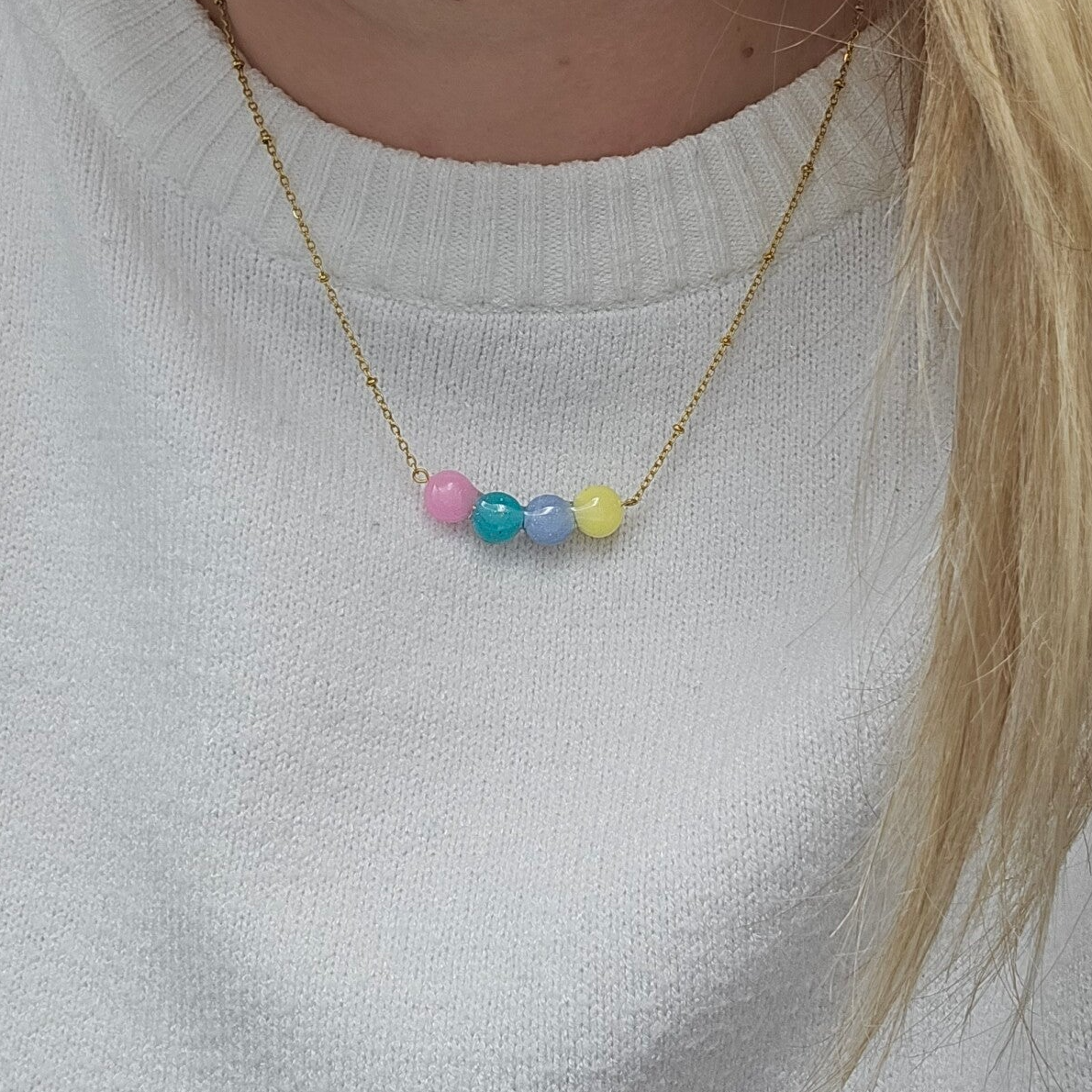 Diese besondere Kette besticht durch die vier kugelförmigen Polymertonanhänger in knalligen Farben: Pink, Grün, Blau und Gelb. Die Anhänger sind mit UV-Hartz lackiert und erhalten dadurch den Glanz.