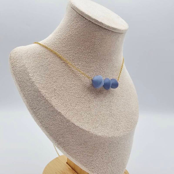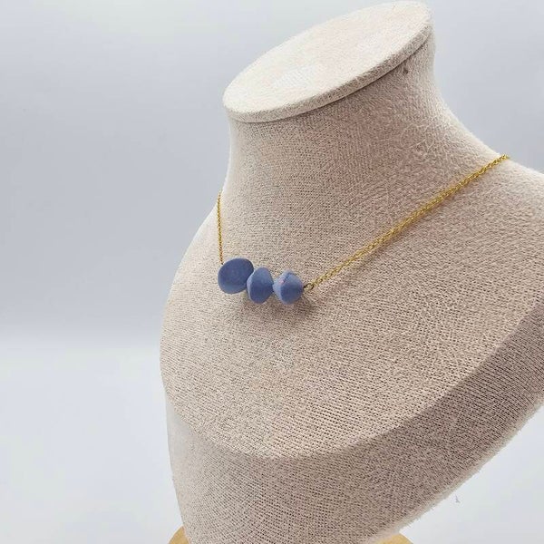 Diese besondere Kette besticht durch die drei kegelförmigen Polymertonanhänger in einem schönen hellblau Farbton.