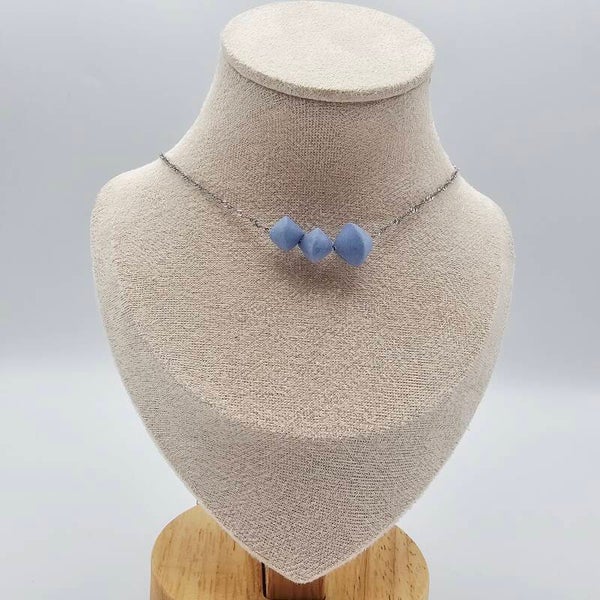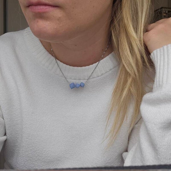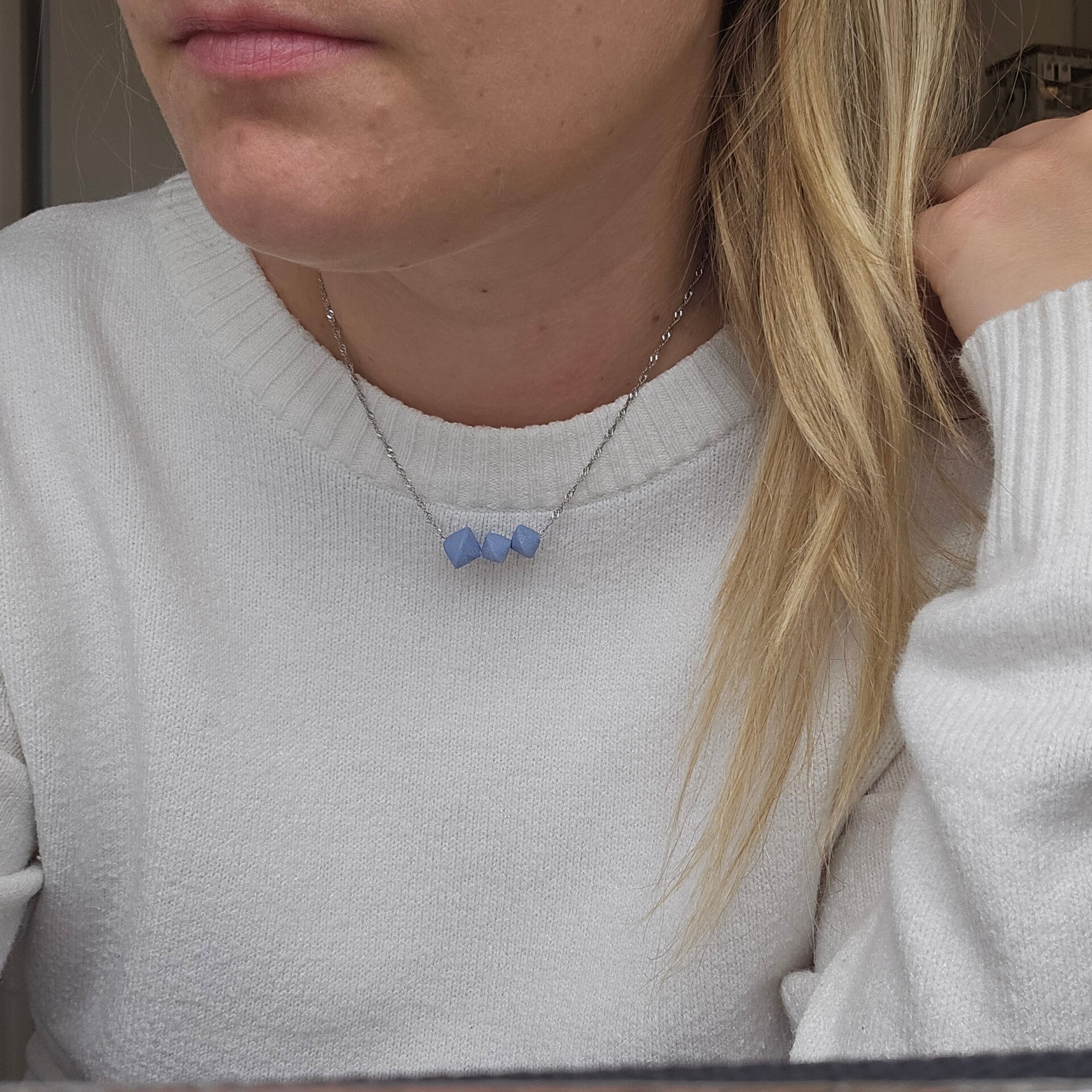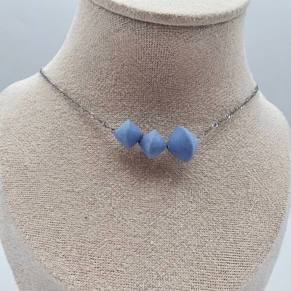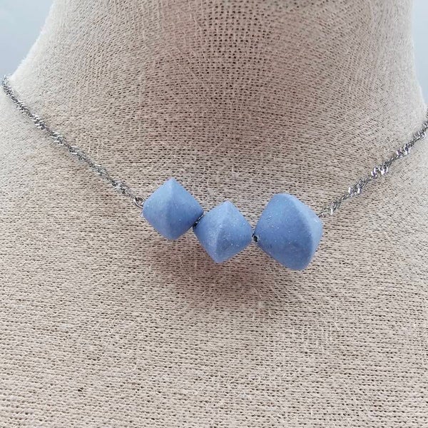 Diese besondere Kette besticht durch die drei kegelförmigen Polymertonanhänger in einem schönen hellblau Farbton.