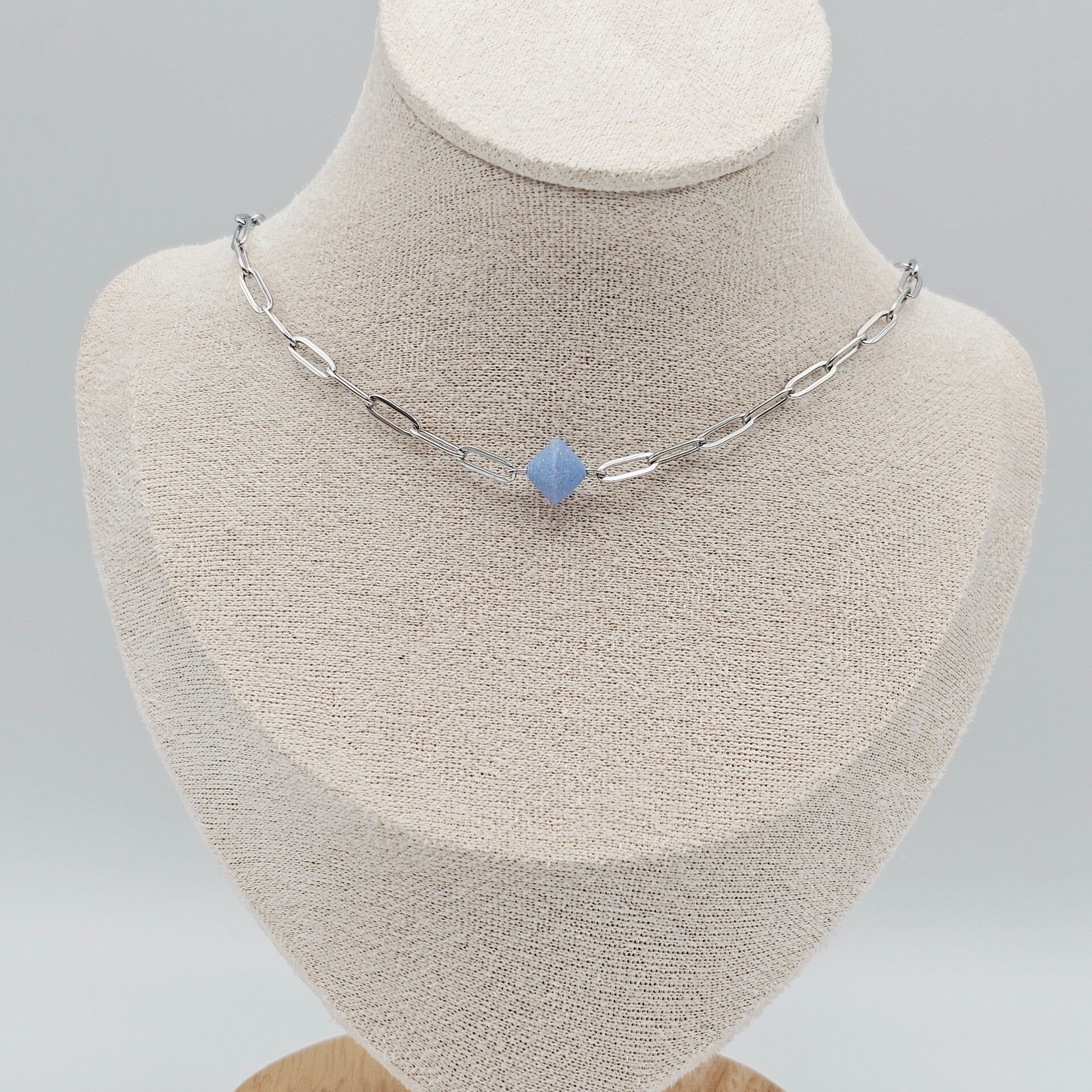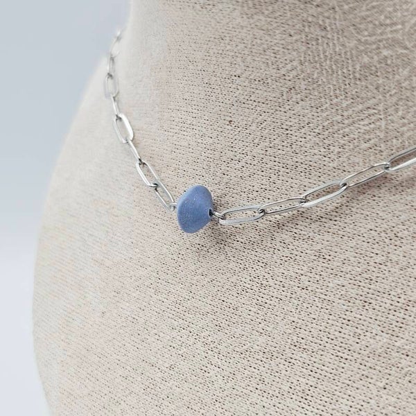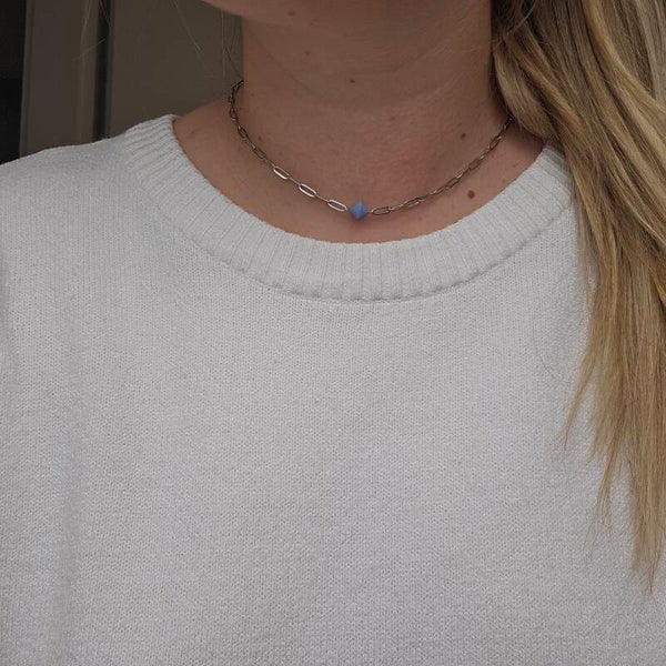 Diese besondere Kette besticht durch den kegelförmigen Polymertonanhänger in einem schönen hellblau Farbton.