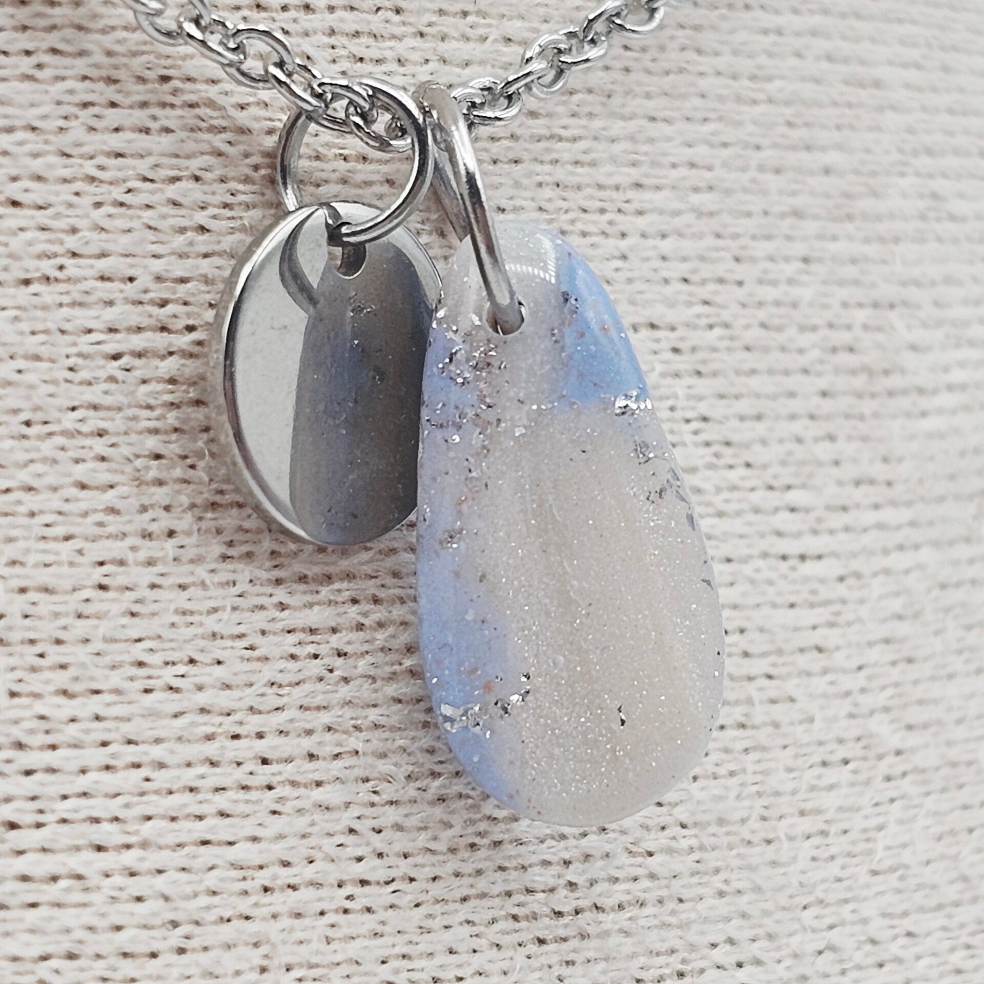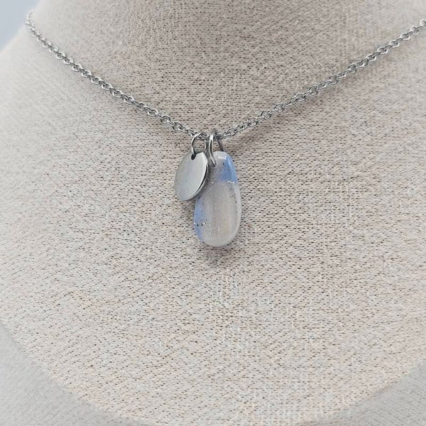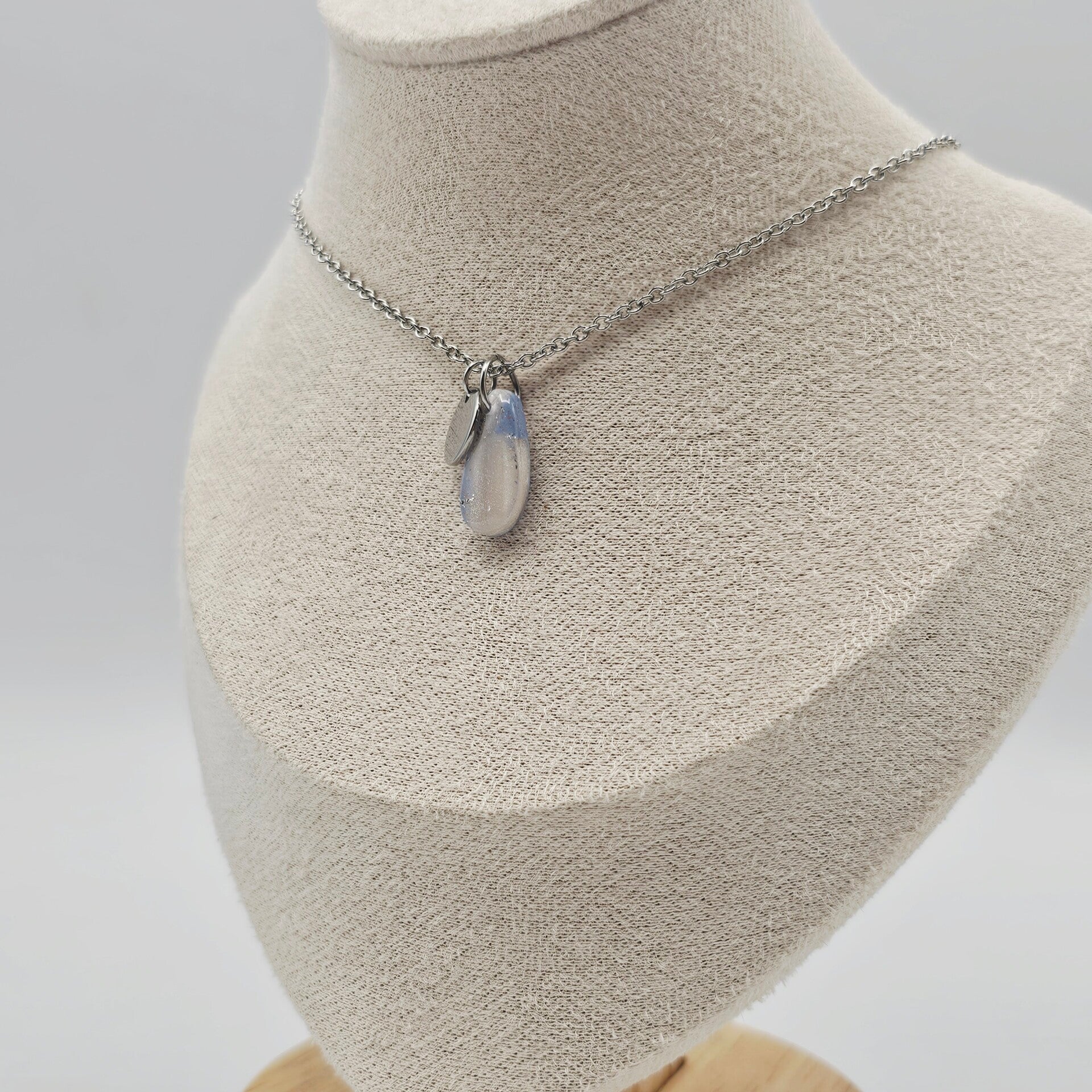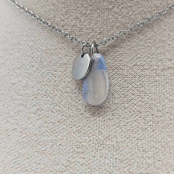 Diese Kette besticht durch den eleganten Tropfenanhänger aus hellblauem und perlmuttfarbenem Polymerton, welcher mit Silberfolieflocken verziert ist.